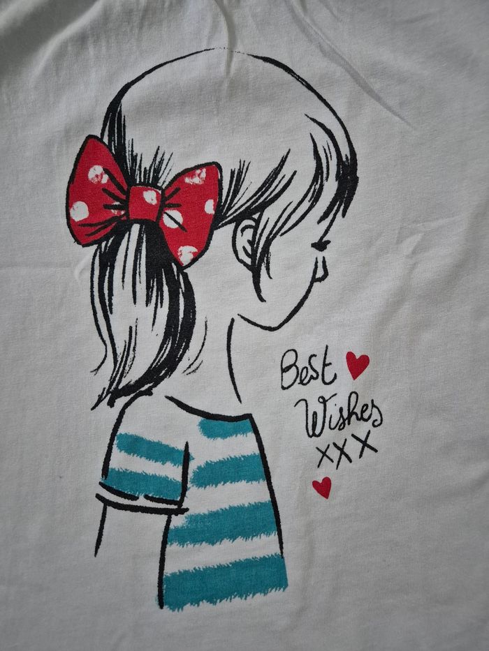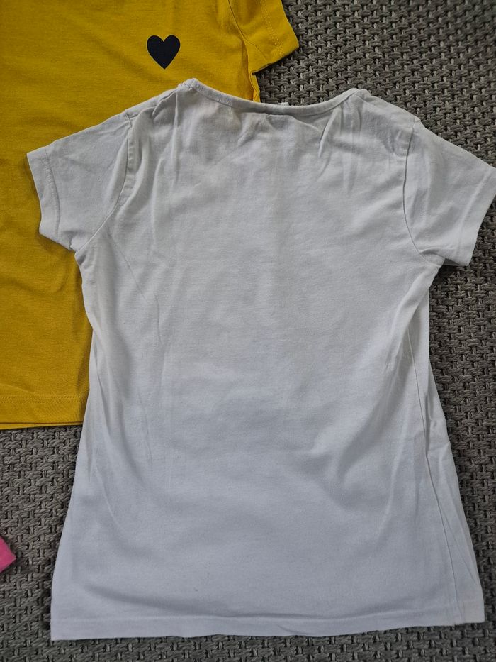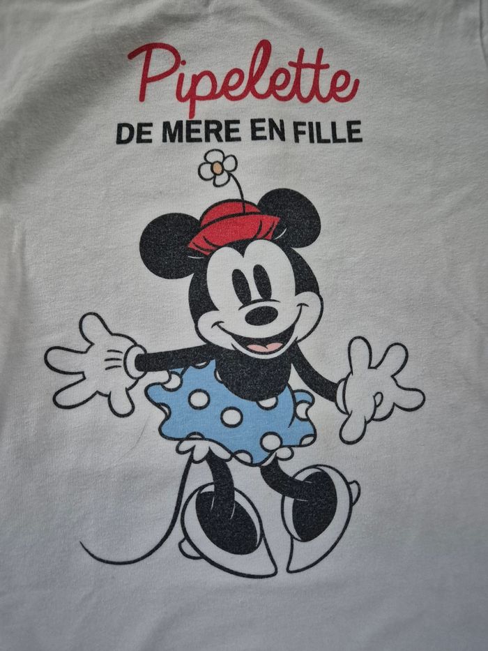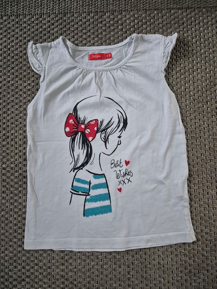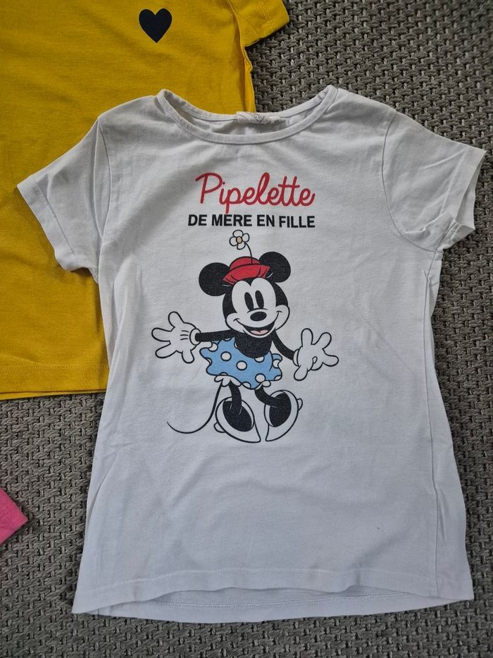 Lot de 2 t-shirts manches courtes souvent portés. Petites tâches discrètes dans le dos de celui avec le motifs fille. Voir dernière photo. Marque tissaia et disney. Taille 8 ans.