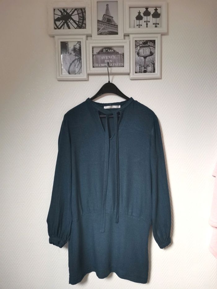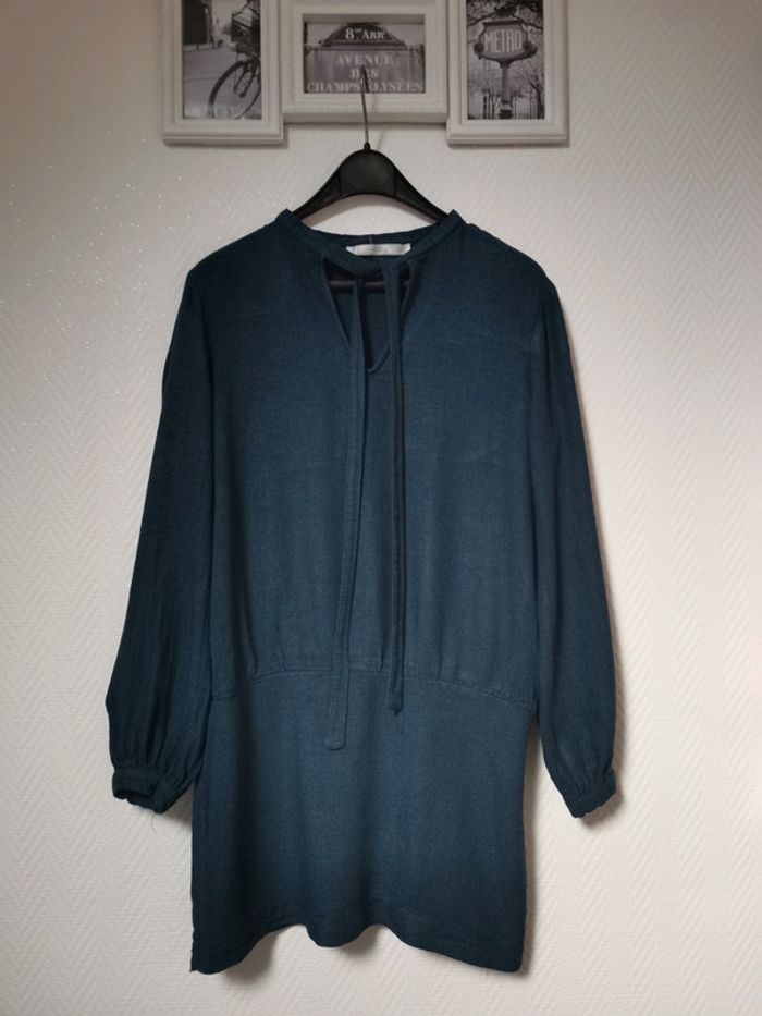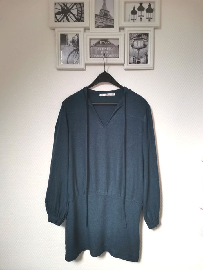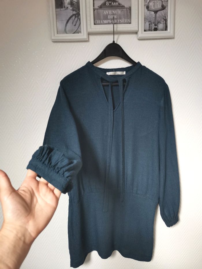 Très belle robe Zara fluide dans une couleur bleu paon très belle et tendance... Manches longues Style robe tunique 1 fermeture éclaire discrete sur le côté Et col V avec 2 lien a nouer Je n'ai plus l'étiquette de taille a l'intérieur mais c'est une taille 36/38 #zara #robezara #robemancheslongues #robecourtezara #taille3638