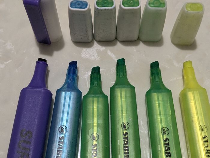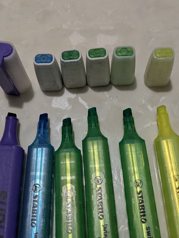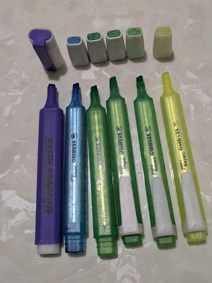 Lot de 6 surligneurs Stabilo swing cool, 3 verts, 1 bleu, 1 jaune et le violet est la marque surligneur. Ils fonctionnent tous parfaitement. Il y a du neuf et du très bon état.