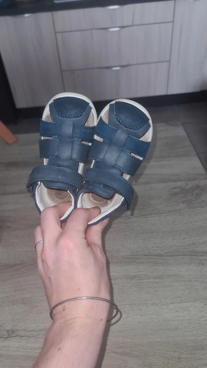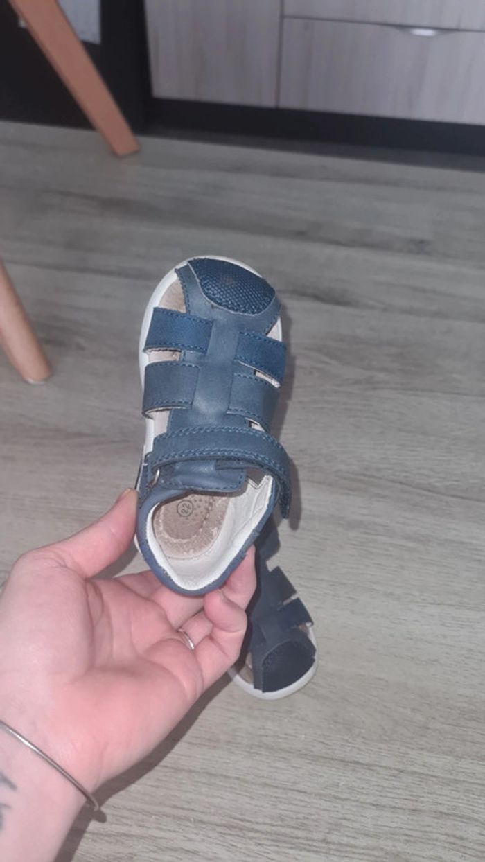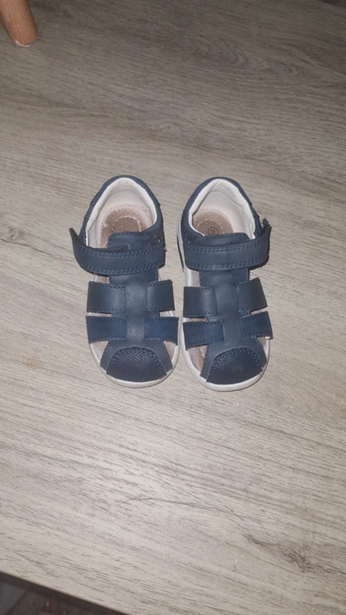Chaussures bébé. En simili cuir bleu foncé. A servis mais reste en bon état. Pas de trous, pas déchiré. T22