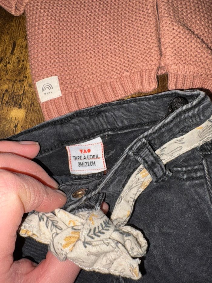 Ensemble avec jean noir et ceinture en tissu fleuri tape à l’œil + gilet à capuche en mailles la redoute Excellent état 🛍️D’autres vêtements 3m en vente: #orlanecollerie3mois
