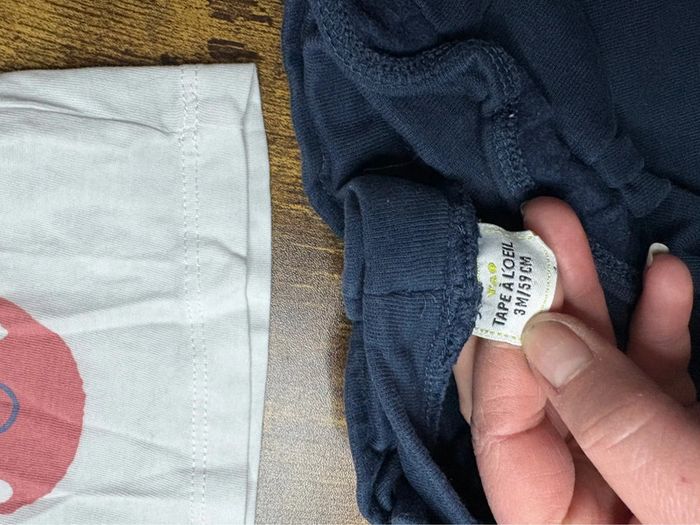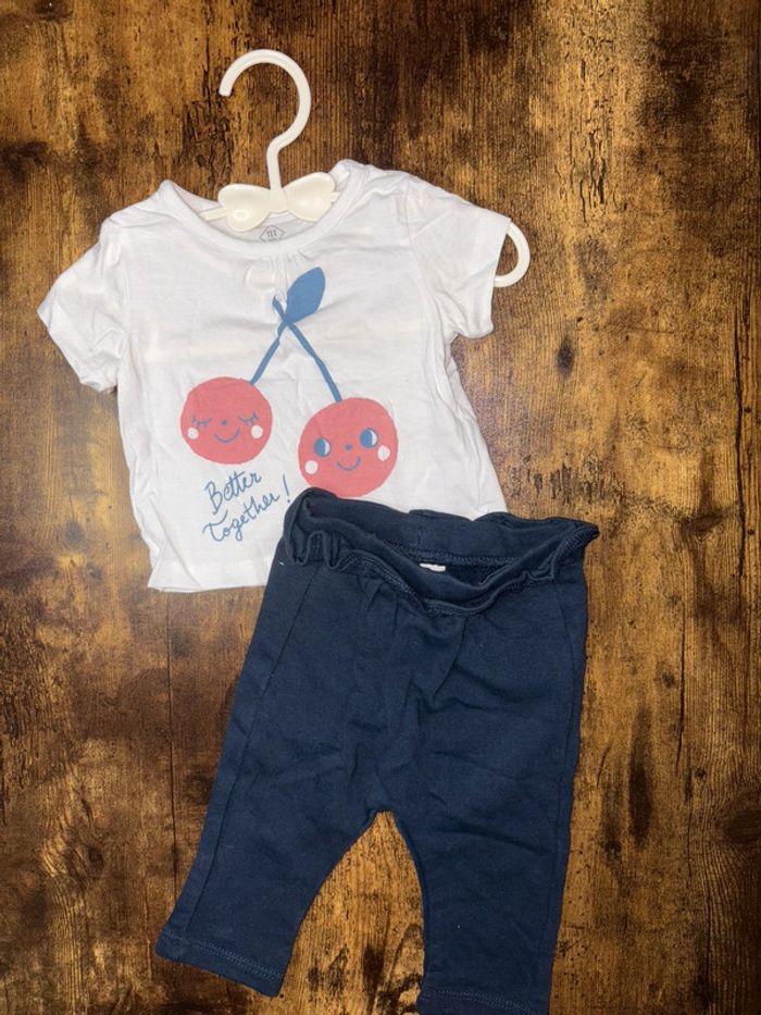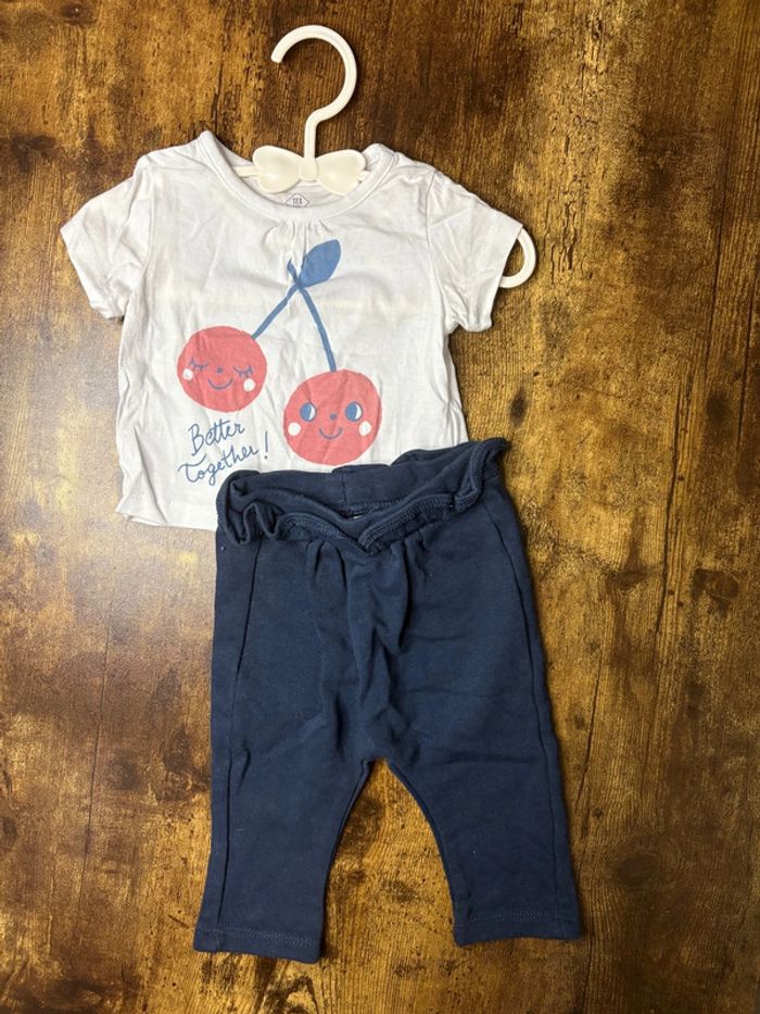 Ensemble avec pantalon bleu marine tape à l’œil et tee shirt manches courtes avec des cerises 🛍️D’autres vêtements 3m en vente: #orlanecollerie3mois