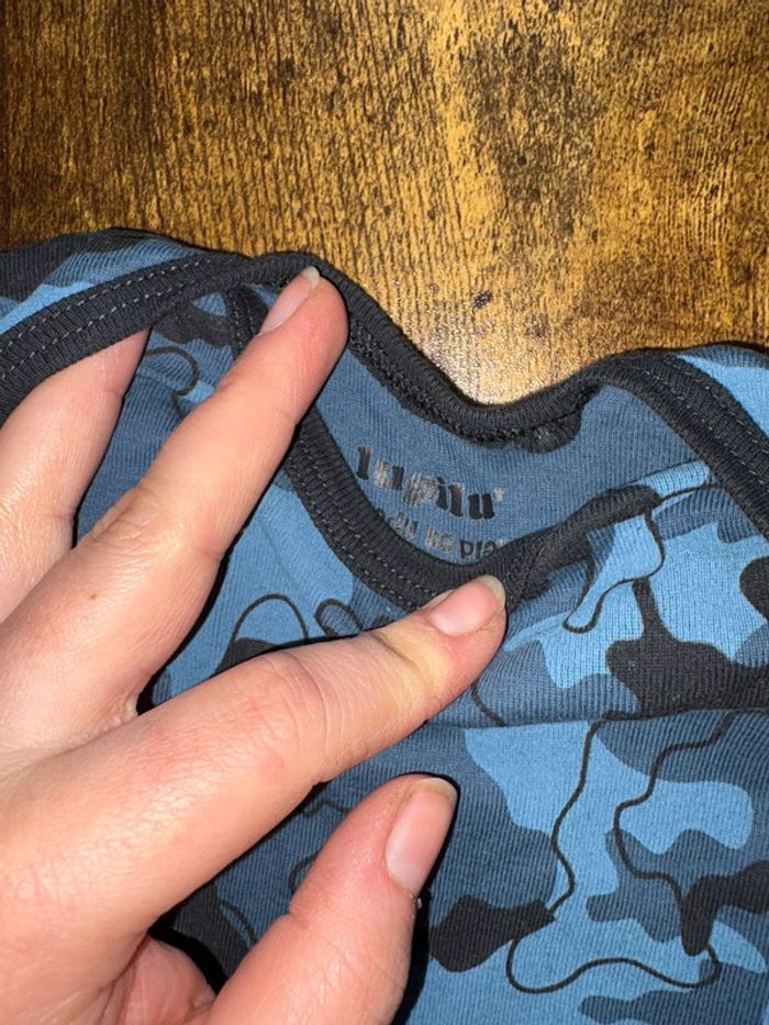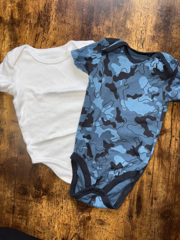 Lot de 2 bodys manche courtes Camouflage bleu et blanc uni 9moiS 🛍️D’autres vêtements 9m en vente: #orlanecollerie9mois