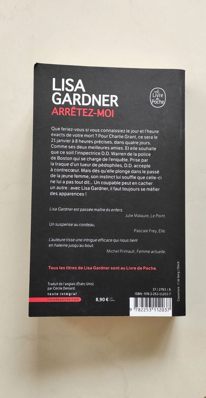 Albin Michel, 1 oct. 2014 - 480 pages Que feriez-vous si vous connaissiez le jour et l'heure exacts de votre mort ? Pour Charlie Grant, ce sera le 21 janvier à 8 heures précises, dans quatre jours. Comme ses deux meilleures amies. Et elle souhaite que ce soit l'inspectrice D.D. Warren de la police de Boston qui se charge de l'enquête. Prise par la traque d'un tueur de pédophiles, D.D. accepte à contrecoeur. Mais dès qu'elle plonge dans le passé de la jeune femme, son instinct lui souffle que celle-ci ne lui a pas tout dit... Un coupable peut en cacher un autre : avec Lisa Gardner, il faut toujours se méfier des apparences ! Sur les listes de best-sellers du New York Times pendant plusieurs semaines, Arrêtez-moi a été salué aux U.S.A. par le Library Journal et l'International Thriller Writers comme un des meilleurs suspenses de l'année.