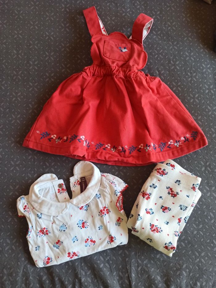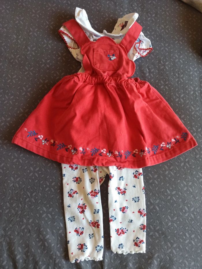 Ensemble fille Sergent major. 6 mois. Bodie manches courtes + robe effet jeans rouge + legging + chaussettes assorties ( pas sur la photo).