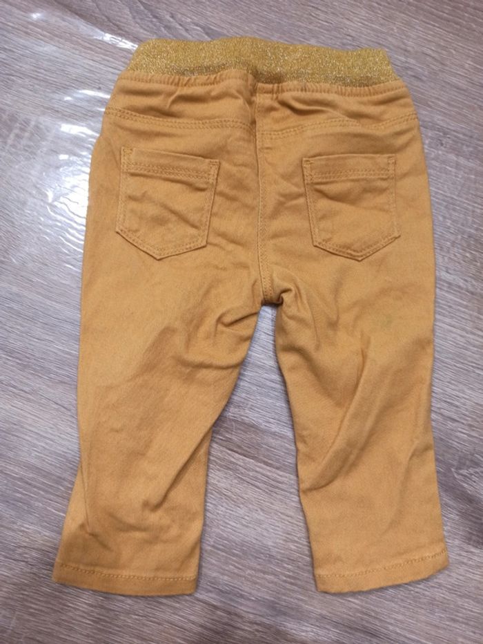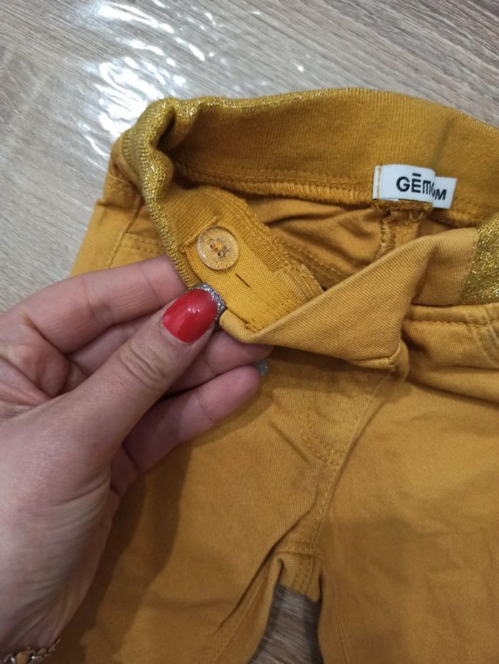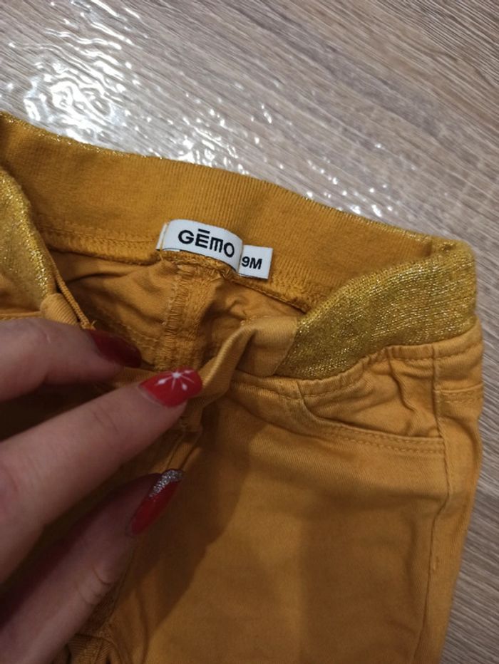 Pantalon jaune moutarde, souple. Ceinture élastique et rétrécisseur intérieur. Fausses poches avant. Confortable. Taille 9 mois