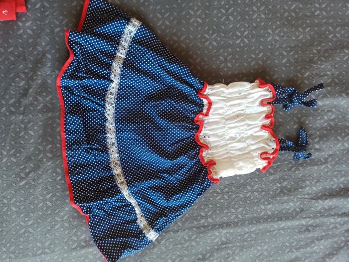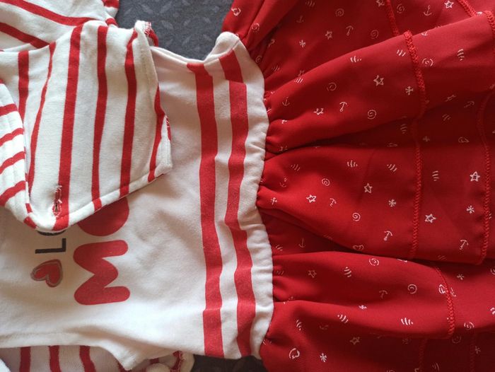 Lot 5 robes différents style. 6 mois. La rouge à une partie légèrement rosé vers le bas ( décoloration du rouge sur le blanc au lavage). Veste jamais portée.