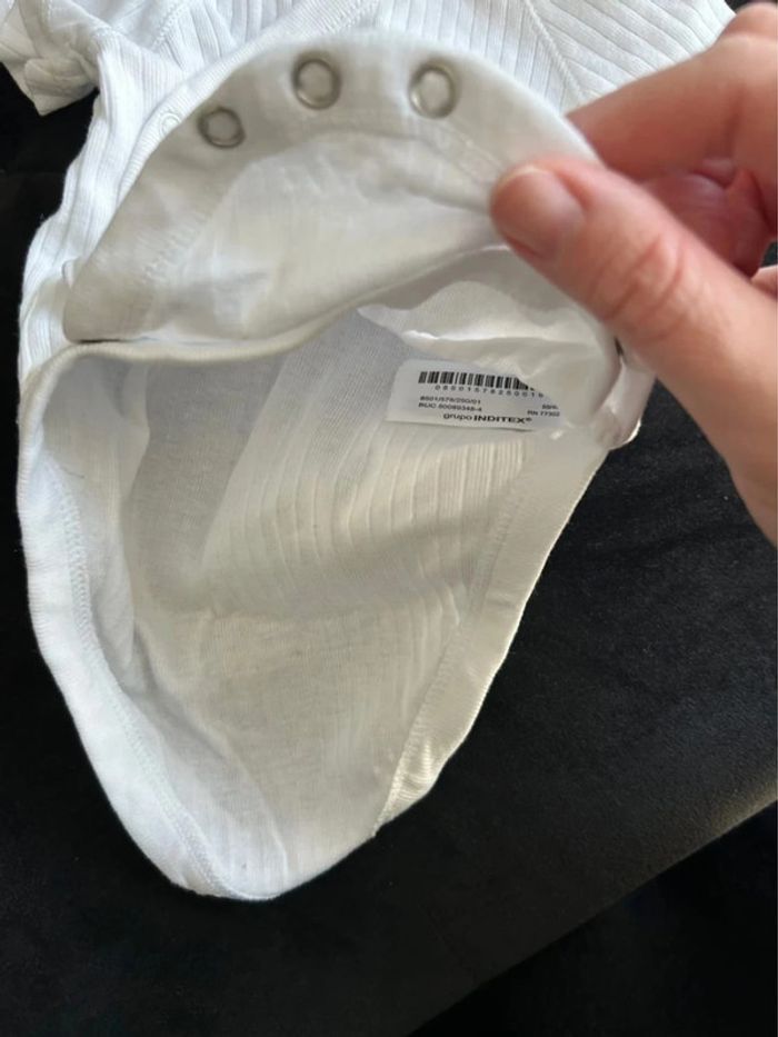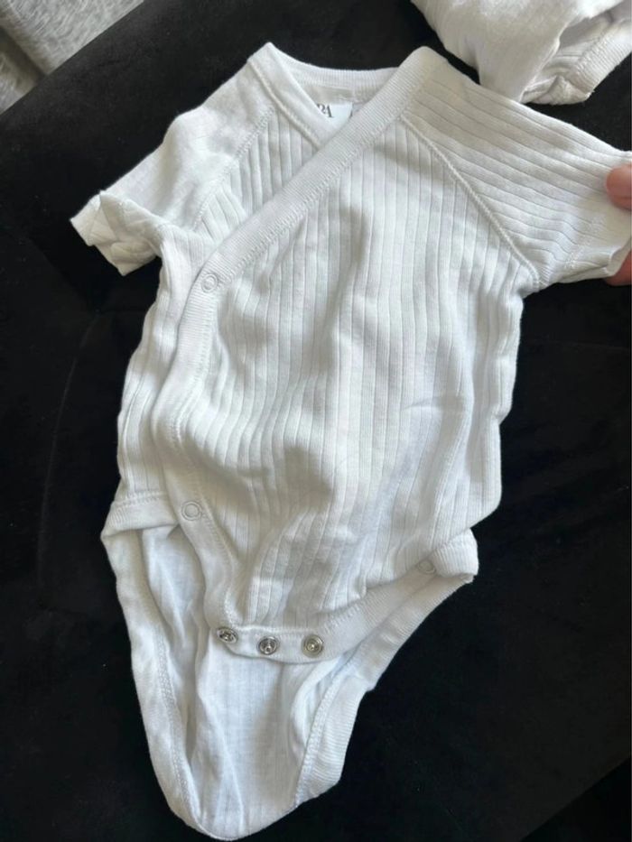 Lot de trois bodys à col kimono et manches courtes. Fermeture par boutons-pression à l’entrejambe.
