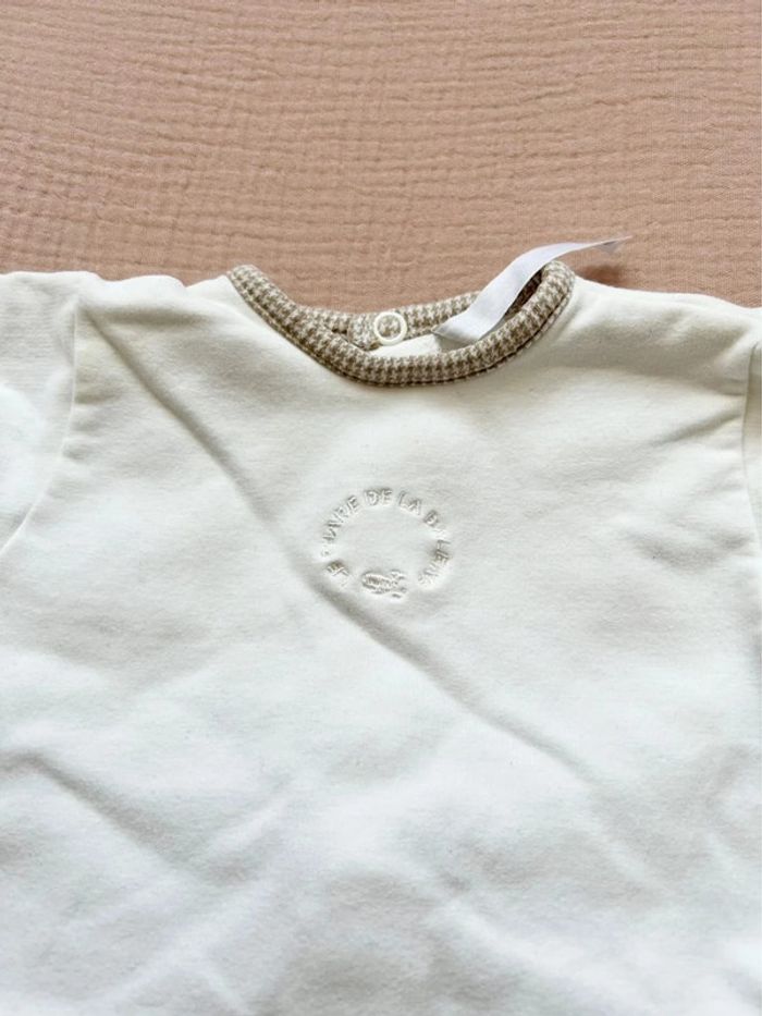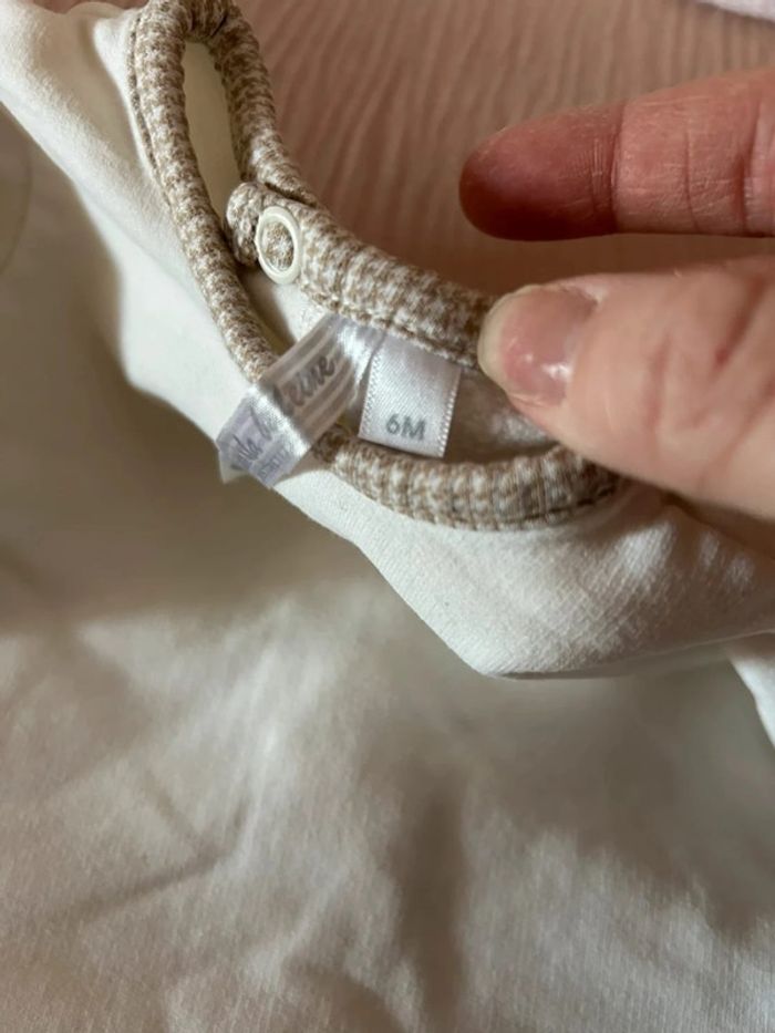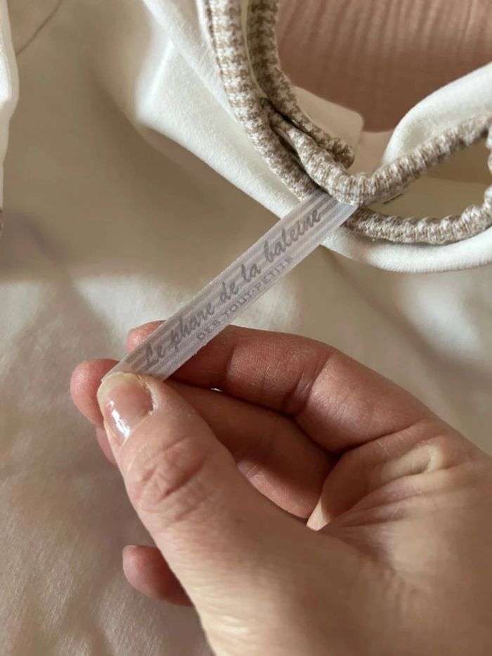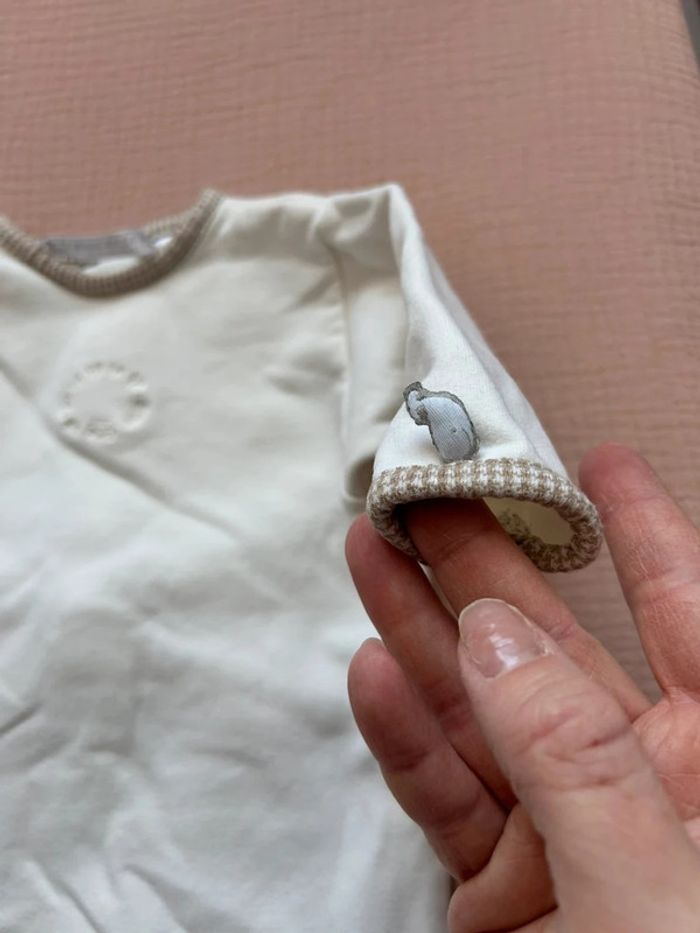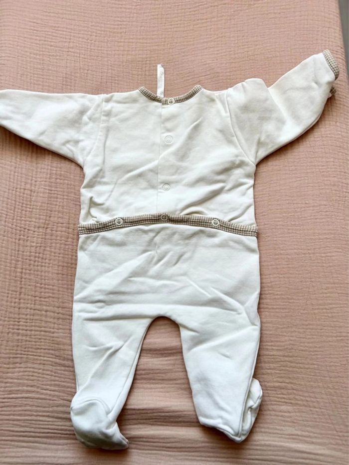 On note une broderie discrète au centre de la poitrine avec des lettres en relief formant un motif circulaire. Il dispose de pieds intégrés pour garder les petits pieds bien au chaud. L’état général semble bon avec un tissu propre et bien conservé.