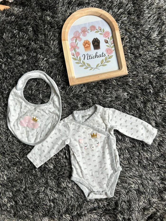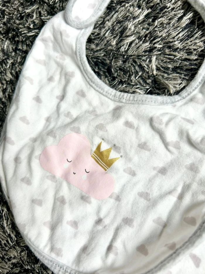✅ 1 bavoir assorti : même motif avec un nuage souriant portant une couronne, fermeture par scratch.