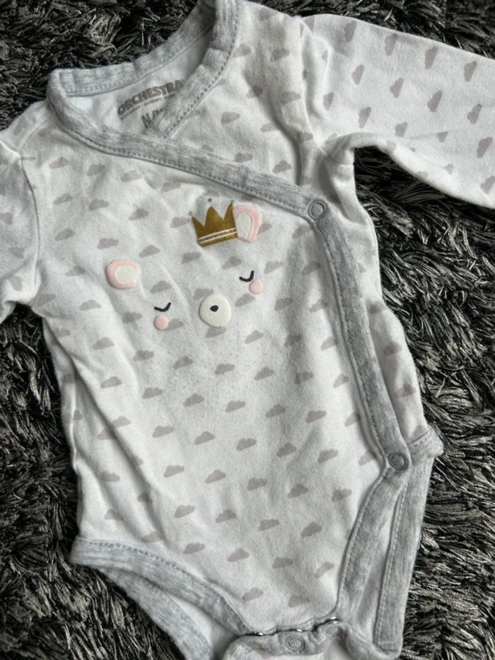 ✅ 1 body manches longues : blanc avec imprimé petits cœurs gris, motif ours endormi avec couronne dorée, fermeture cache-cœur à boutons-pression pour un habillage facile.