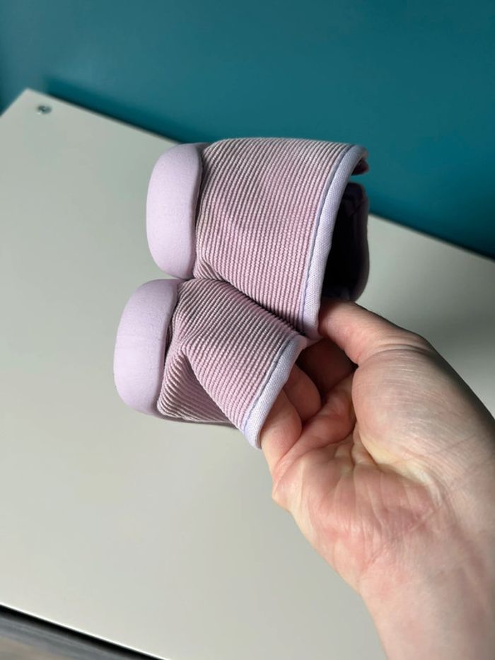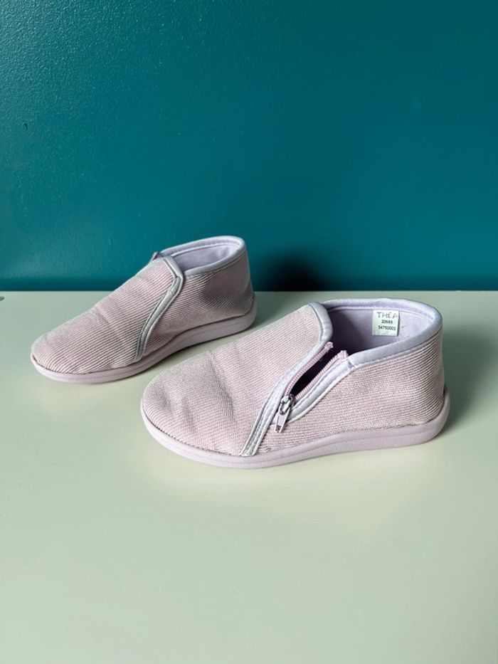 une paire de chaussons pour enfant, de couleur rose pâle, en pointure 27. Ces chaussons montants sont dotés d'une semelle souple et confortable. L'un des chaussons est muni d'une fermeture éclair latérale pour un enfilage facile, tandis que l'autre est un modèle à enfiler simple. L'intérieur du chausson avec la fermeture éclair.