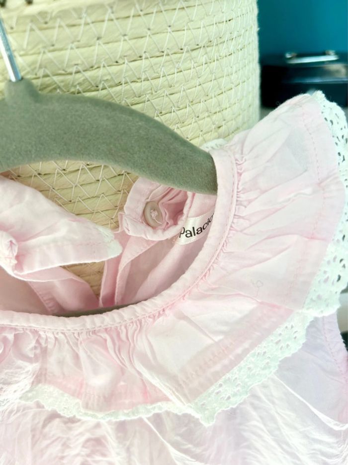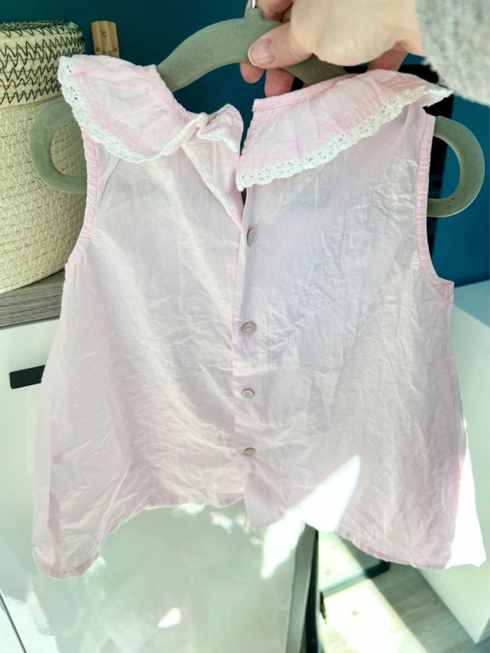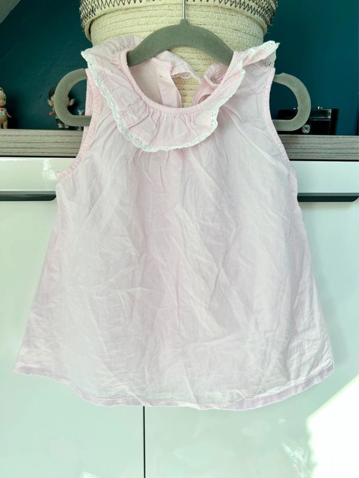 Blouse légère et fluide, rose pale avec le volant volant et broderie blanche. Sans manches pour les journées chaudes d’été. Cette blouse a la coupe trapèze n’a jamais été mise.