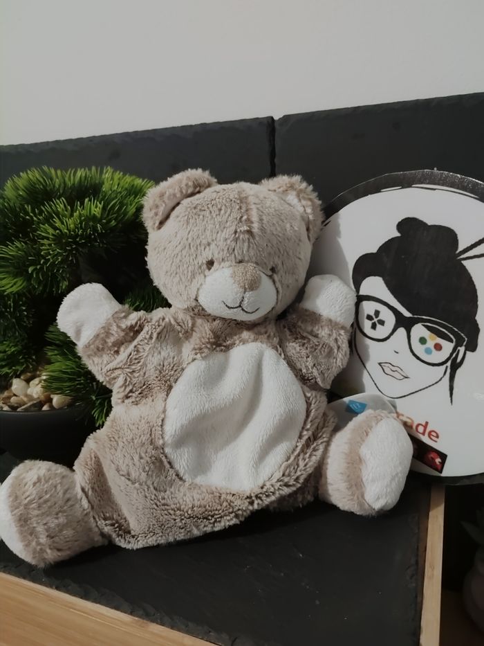 doudou marionnette tex baby blanc marron beige rond sourire ponpon  DD003202 - photo numéro 1