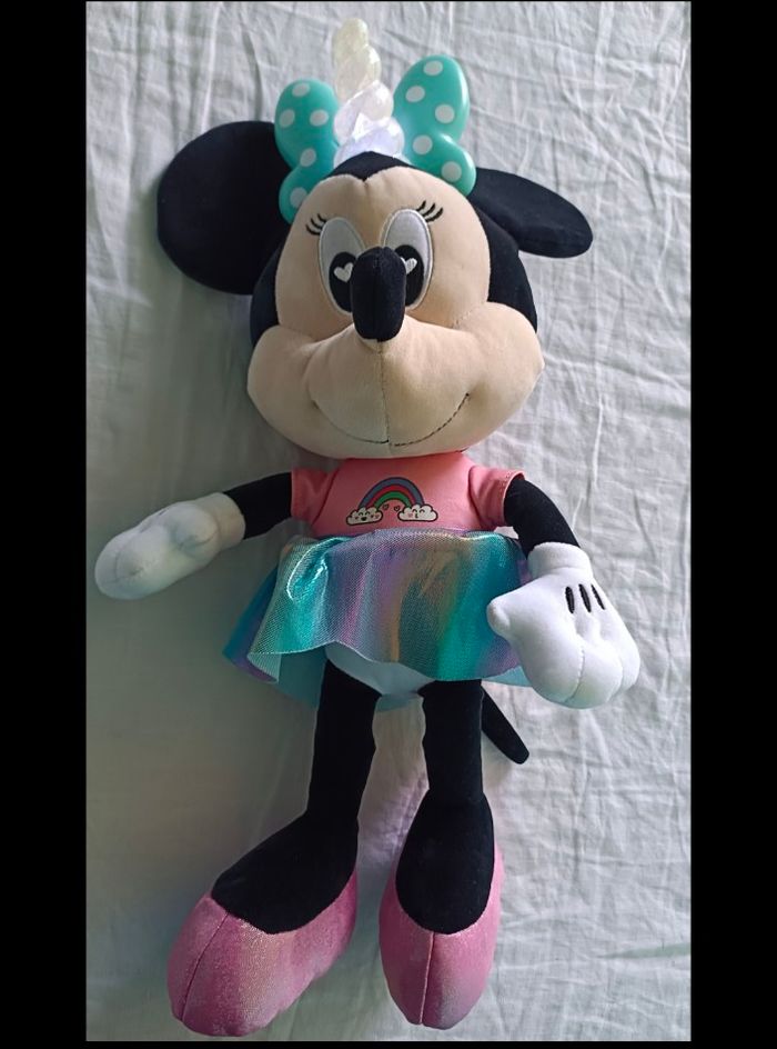 Comme neuve, servie que quelques heures car la période Minnie était terminée lors de la réception du cadeau. Découvrez la plus coquette des souris Disney avec cette peluche Minnie licorne magique. Cette jolie peluche de 40 cm à l'effigie de Minnie, porte un bel ensemble de couleur rose ainsi que son célèbre nœud accompagné d'une jolie corne pour plus de féerie.  Il suffit d'appuyer sur sa main et la corne de sa tiare s'illuminera de toutes les couleurs pour retrouver la magie de Disney ! Votre enfant sera ravi de retrouver cette peluche réconfortante pour jouer avec elle et la câliner. Nécessite 3 piles LR06 incluses mais en fonction prévoir de les changer. #jeuxjouetscamilled974 #Minnie #licorne #lumineuse #multicolore