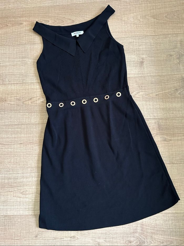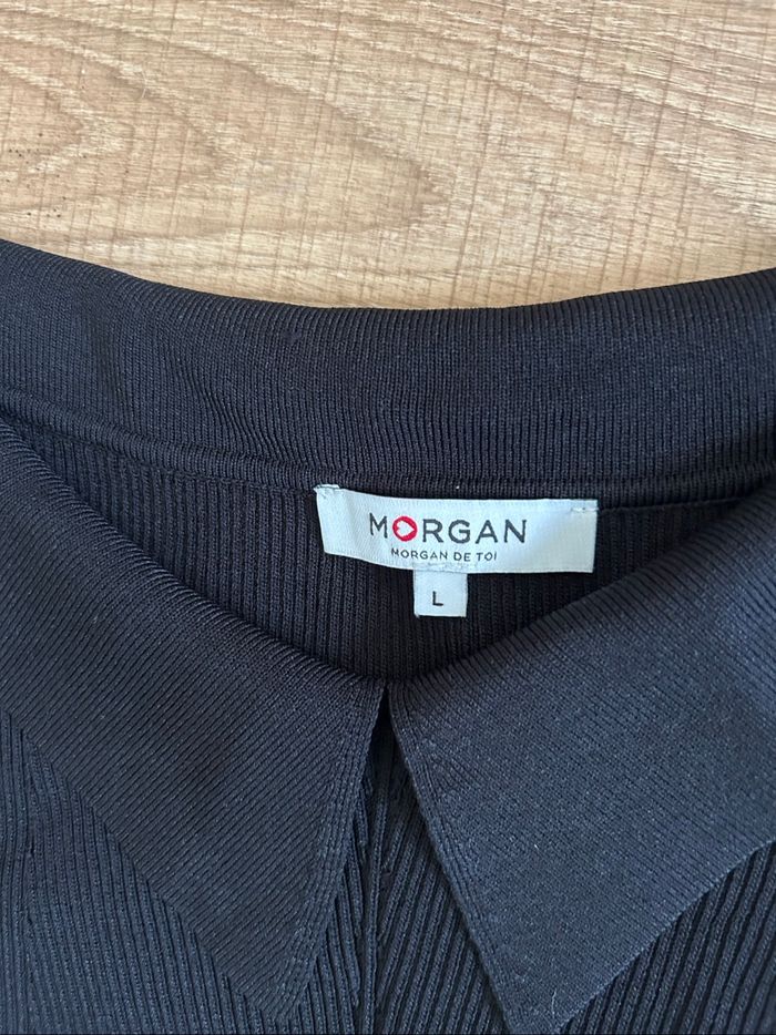 Magnifique robe noire sans manches, de marque Morgan. Taille L. Portée une fois, elle est comme neuve. aisselle à aisselle 44 cms et plus taille 39 cms et plus longueur depuis épaule 96 cms Le tissu est extensible Étiquette intérieure de composition coupée