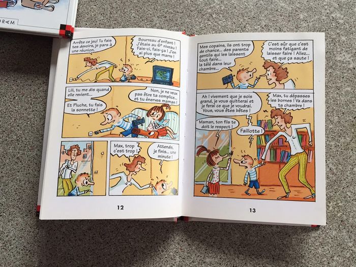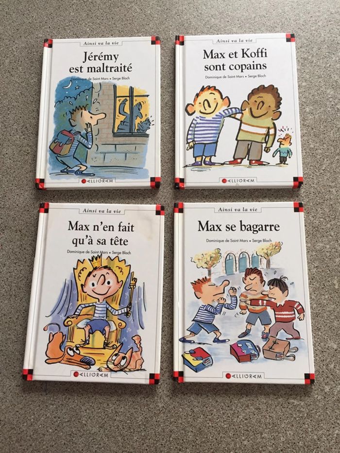 Lot de 4 livres Lili et Max Max n’en fait qu’à sa tête Max se bagarre Max et Koffi sont copains Jeremy est maltraité Très bon état juste une tache sur Max n’en fait qu’à sa tête en haut à droite voir photo Des livres très bien écrits avec des mots pour expliquer les choses de la vie Pas toujours facile de trouver les mots pour les adultes Les livres ne sont ni scotchés ni gribouillés