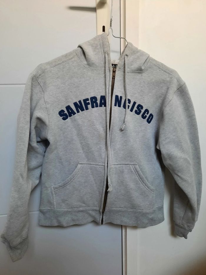 Gilet à capuche manches longues écrit San Francisco. 80% Cotton & 20% Polyester. Juste trace de peinture blanche sur arrière bras gauche.