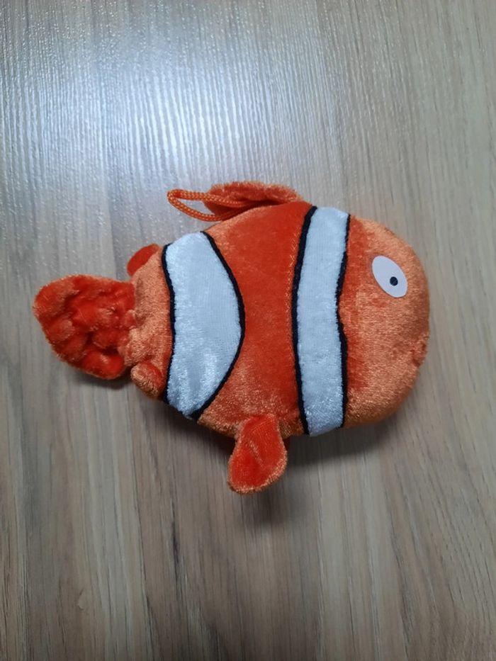 Petite peluche poisson-clown orange & blanc. Peut s'accrocher !