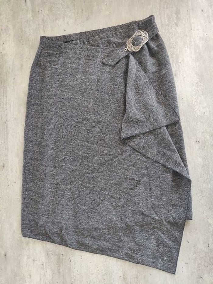 Jupe portefeuille grise 40 asymétrique Longueur genoux Ceinture avec boucle métal Un œillet de la ceinture est abîmé (voir dernière photo)