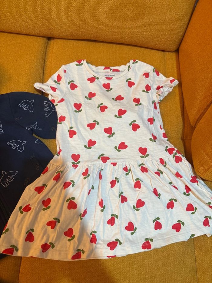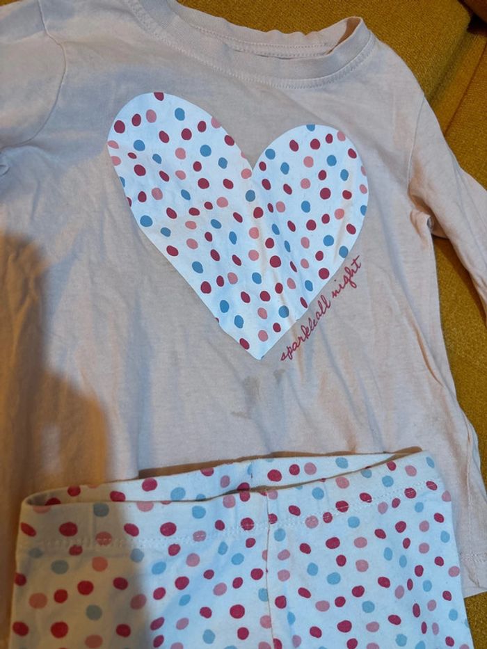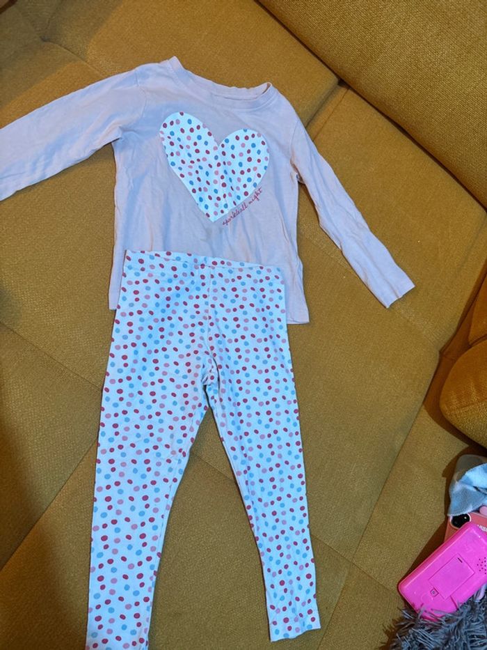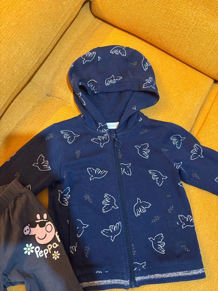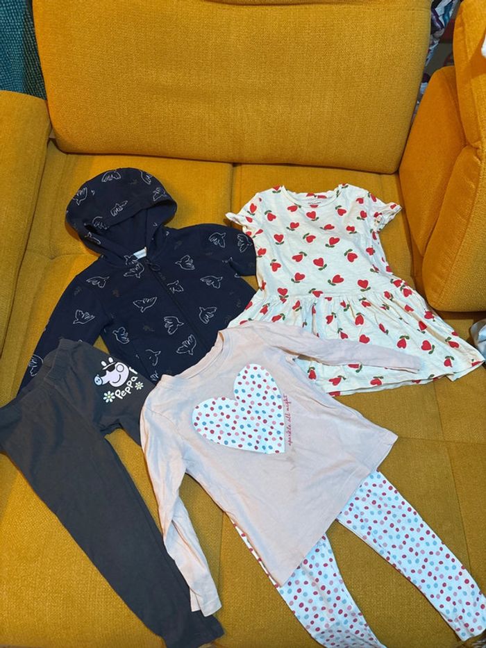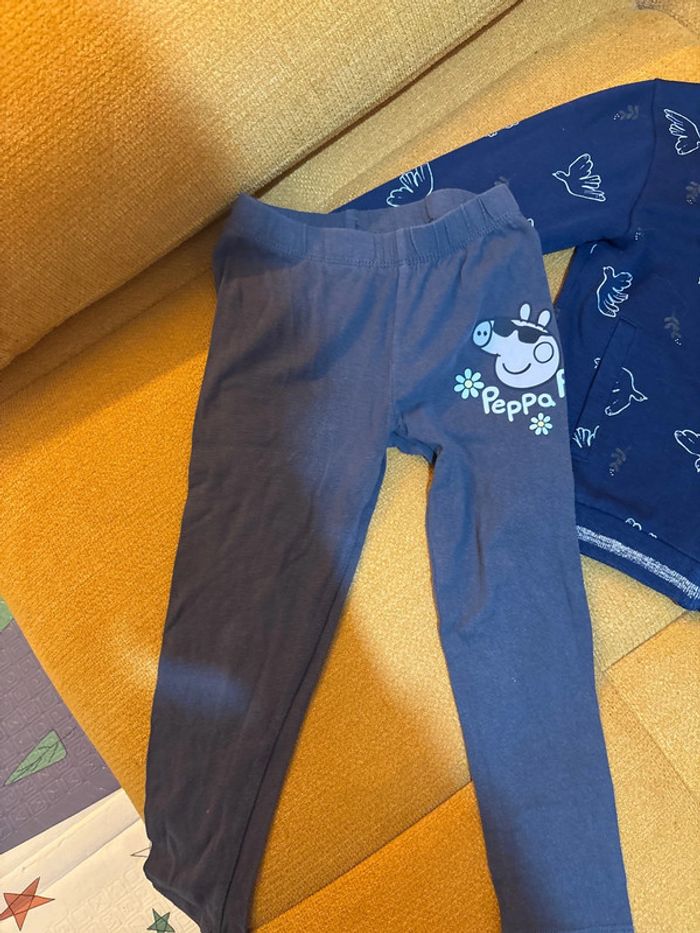 Lot comprenant un gilet, un legging peppa pig, une robe neuve et un pyjama légèrement taché sur le devant (voir photo)