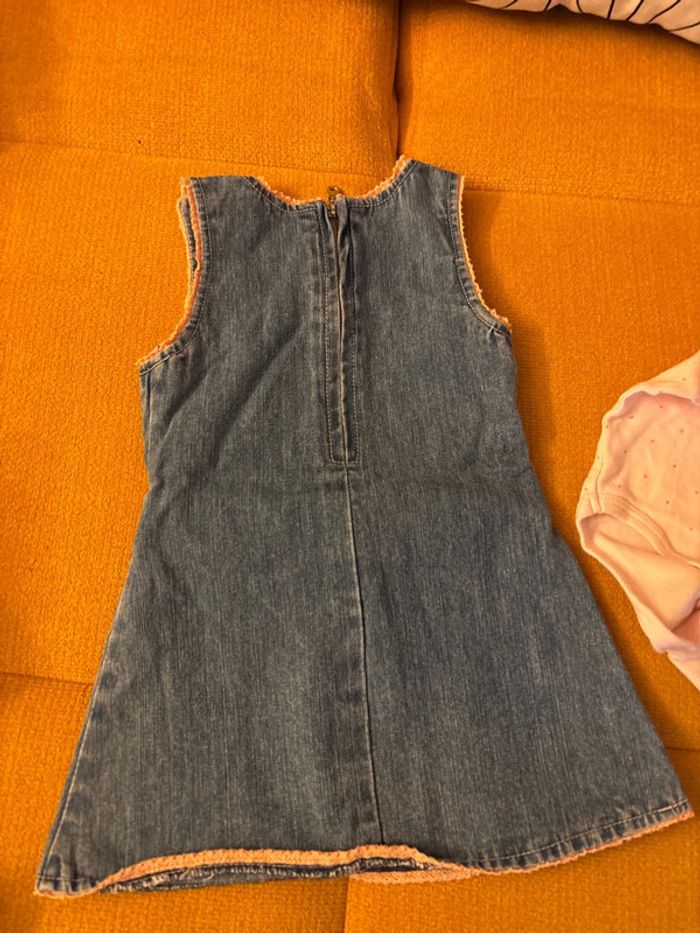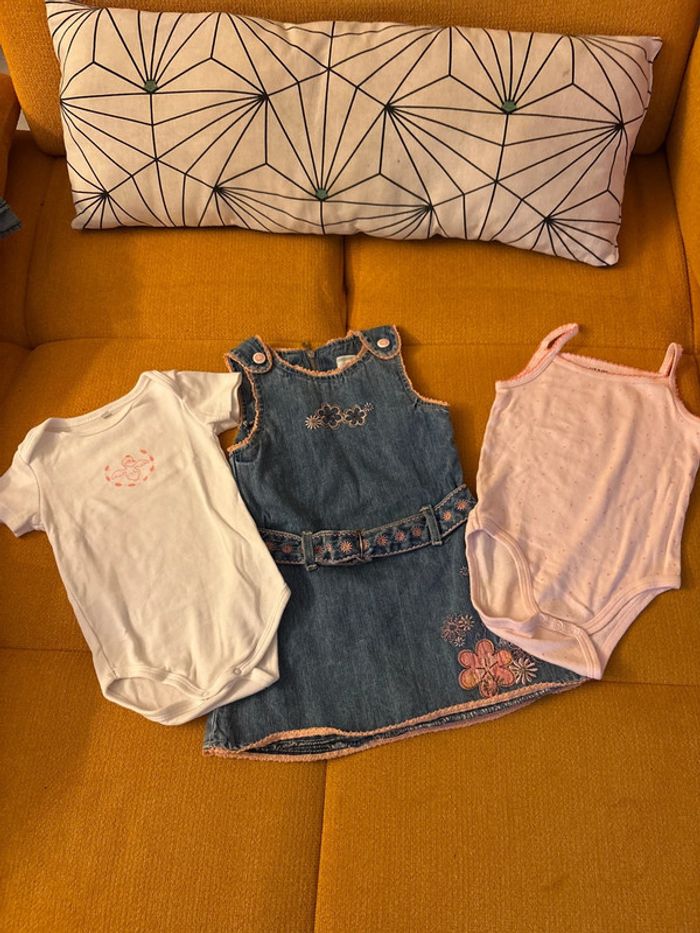 Lot comprenant deux bodies : un débardeur et un manches courtes neufs kiabi Et une robe en jean kimbaloo en très bon état