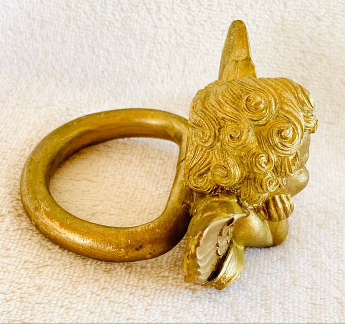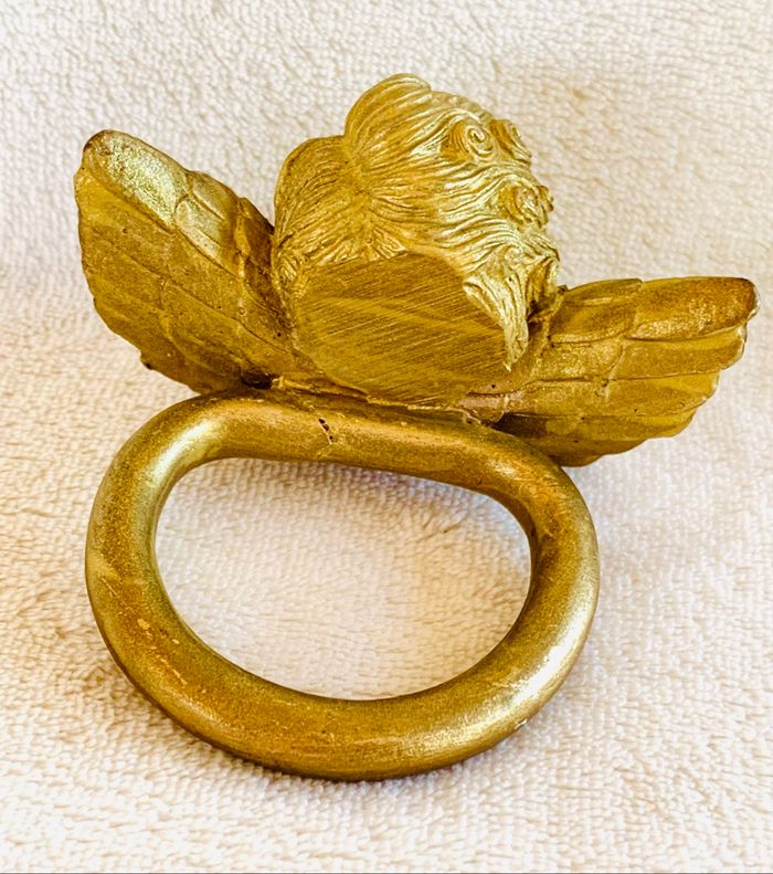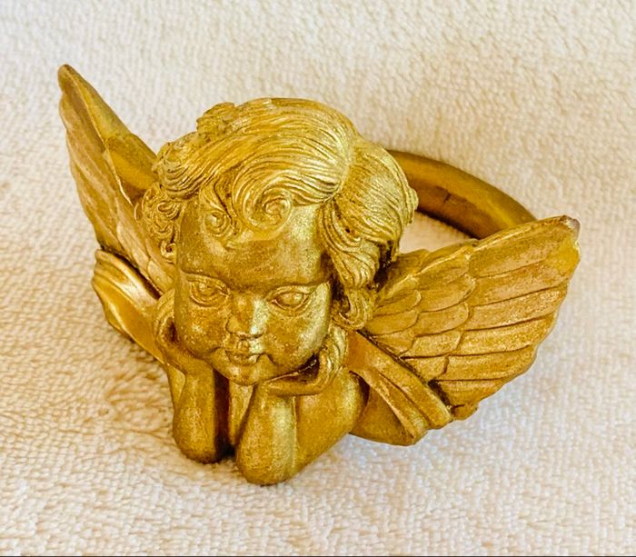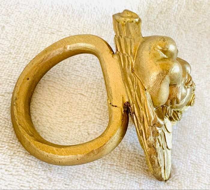 Rond de serviette, Ange doré En plâtre peint doré. Hauteur 5cm x 7,5 x 8cm Utilisé pour décorer un rideau *L’anneau était cassé et recollé. ⛔️ Prix FIXES, NON négociables 🚨  👏🏻 Réductions sur les lots 👍🏻 #ange #doré #ronddeserviette #cc_divers