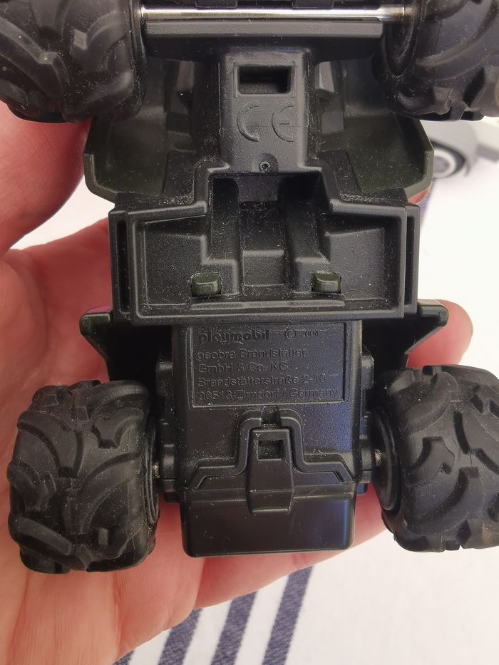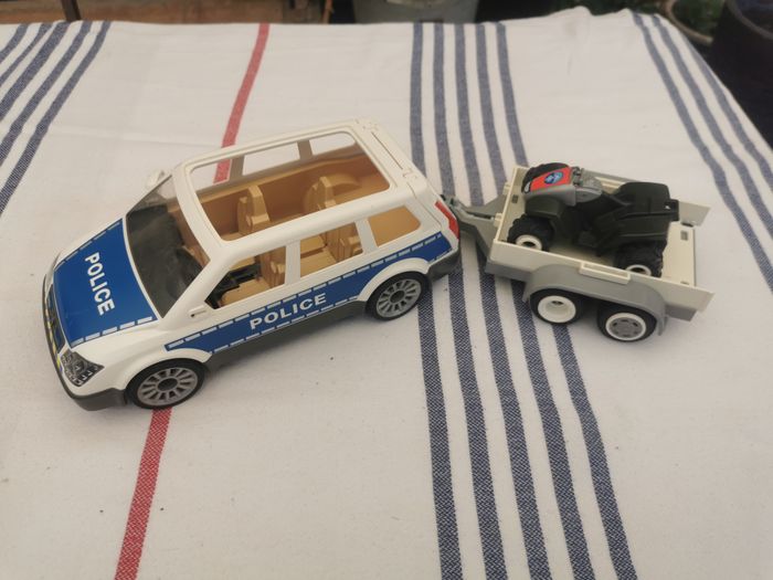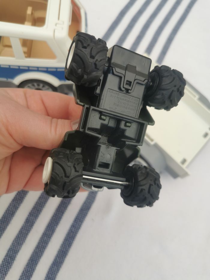 Quad avec sa remorque Playmobil, en très bon état, il manque un enjoliveur, peut s’accrocher à la voiture de police ou la voiture rose qui sont aussi en vente séparément sur ma page. Taille quad 9x7x4,5 cm, taille de la remorque 17x11,5x5,5 cm, poids de l’ensemble (non dissociable) 113g.