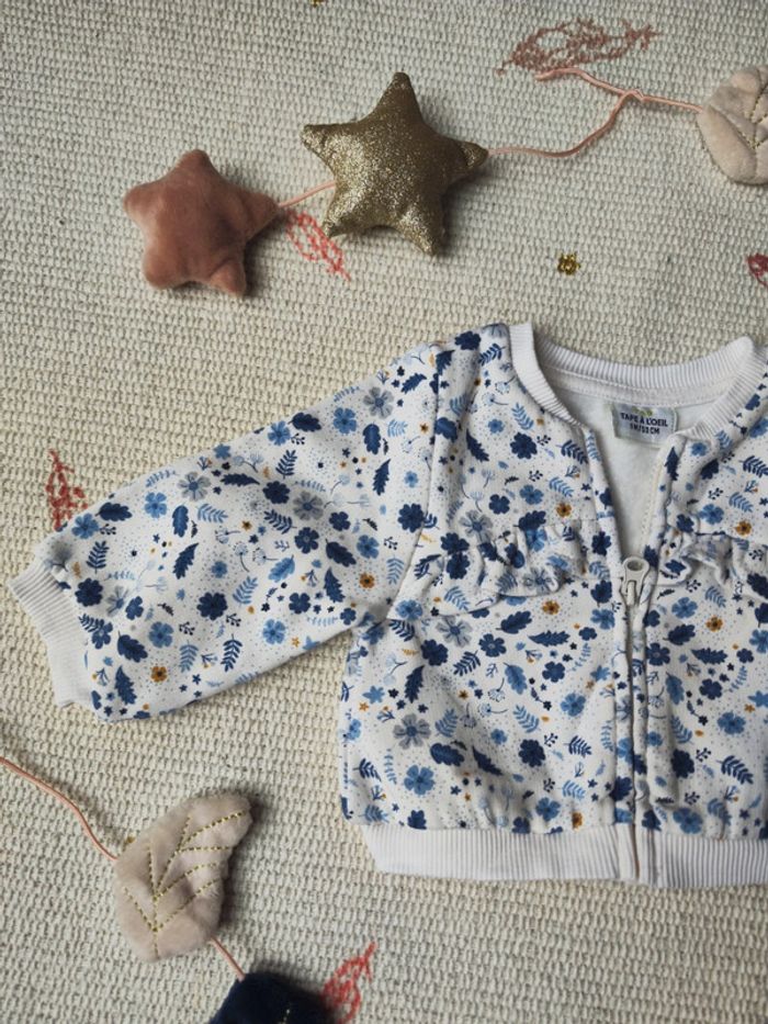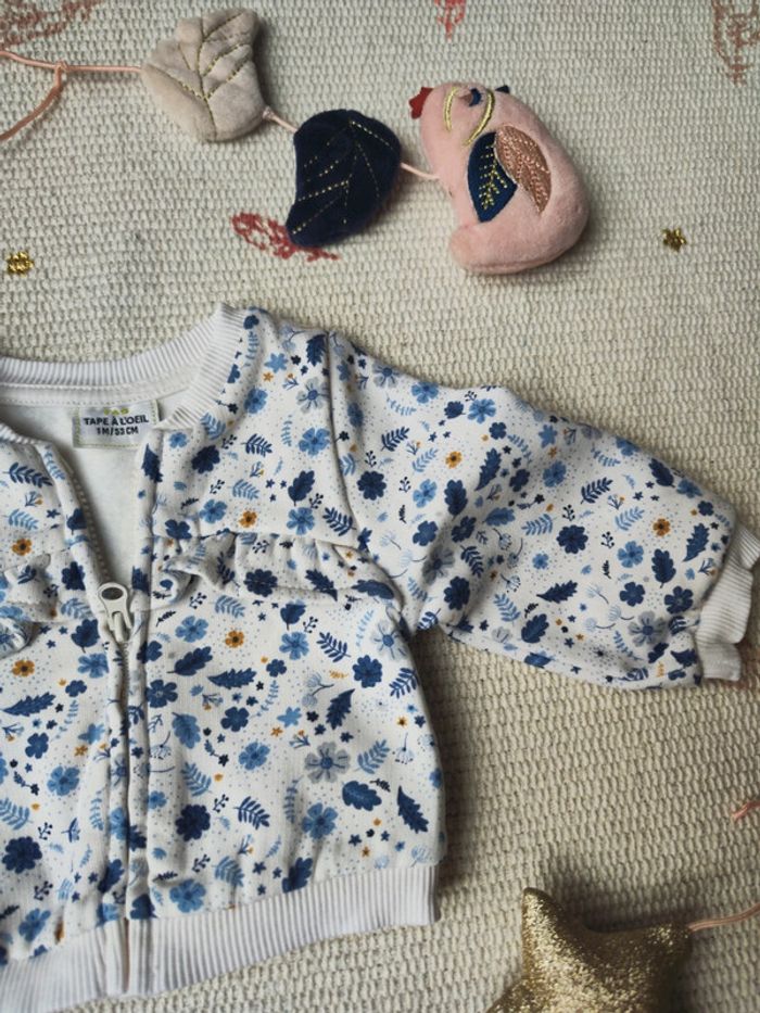 #alino23vetementfille1mois Joli gilet zippé pour bébé fille, taille 1 mois Motif fleuri dans les tons bleu, blanc et moutarde, parfait pour les tenues de tous les jours. 🧥 Fermeture zippée sur le devant 🌼 Motifs floraux élégants et discrets 🧵 Matière douce, confortable à porter pour les premiers mois Idéal à glisser sur un body ou une combinaison à la mi-saison. 🧼 État : très bon état, peu porté 🚭 Maison non-fumeur 📦 Envoi rapide et soigné 💬 Réduction si achat groupé avec d'autres articles de ma boutique