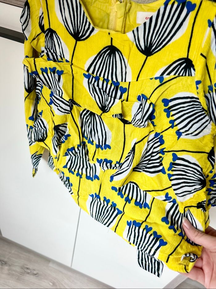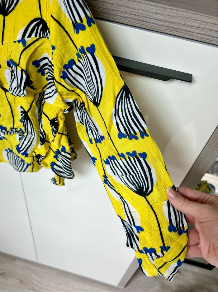 Magnifique haut léger Catimini, imprimé floral graphique sur fond jaune éclatant. Manches longues légèrement bouffantes, volants sur le devant et fermeture zippée dans le dos. Tissu texturé très agréable à porter pour la mi-saison ou les soirées d’été.