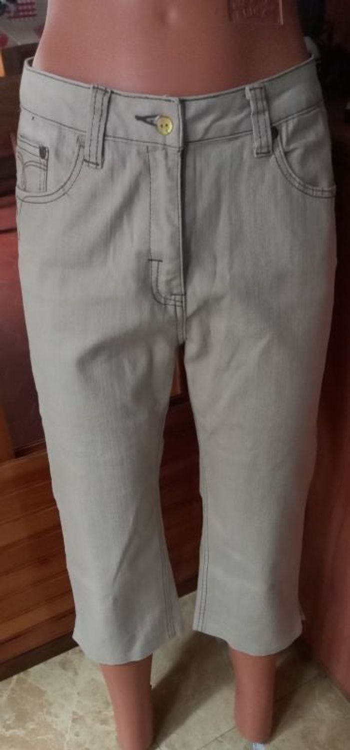 pantacourt beige biais couture marron ,passants ceinture, 4 poches 2 devant et 2 arrière entrejambe 47 cms 20 base.97%coton et 3%Lycra