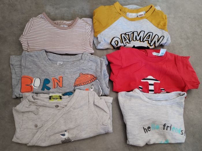 ! Tout sera bien-sûr repassé avant d'être envoyé ! Lot de vêtements en 3 mois avec : 9 bodys manches longues 4 bodys manches courtes 1 t-shirt manches courtes 6 t-shirts manches longues 5 gilet épais dont 4 à fermeture éclair et capuche 1 pull 2 salopettes [dont une neuve de la marque pat pat 8 pantalons dont 2 légers et 1 avec bretelles 9 pyjamas velours (dont 2 qui n'apparaissent pas car limite de photos) 3 pyjamas léger (qui n'apparaissent pas car limite de photos mais bien inclus dans le lot). 2 chemises à manches longues Total de 50 vêtements. De tout en terme de marques : H&M, Pat pat, Tex, orchestra, mots d'enfants, Disney, little culbuto, tissaia, boîte à malices, kiabi, mes petits cailloux, sergent major etc...