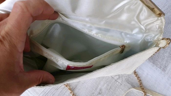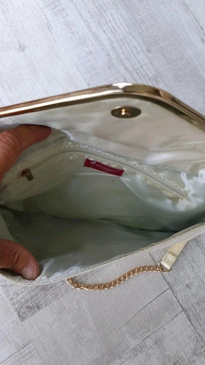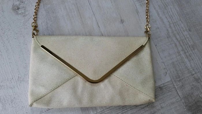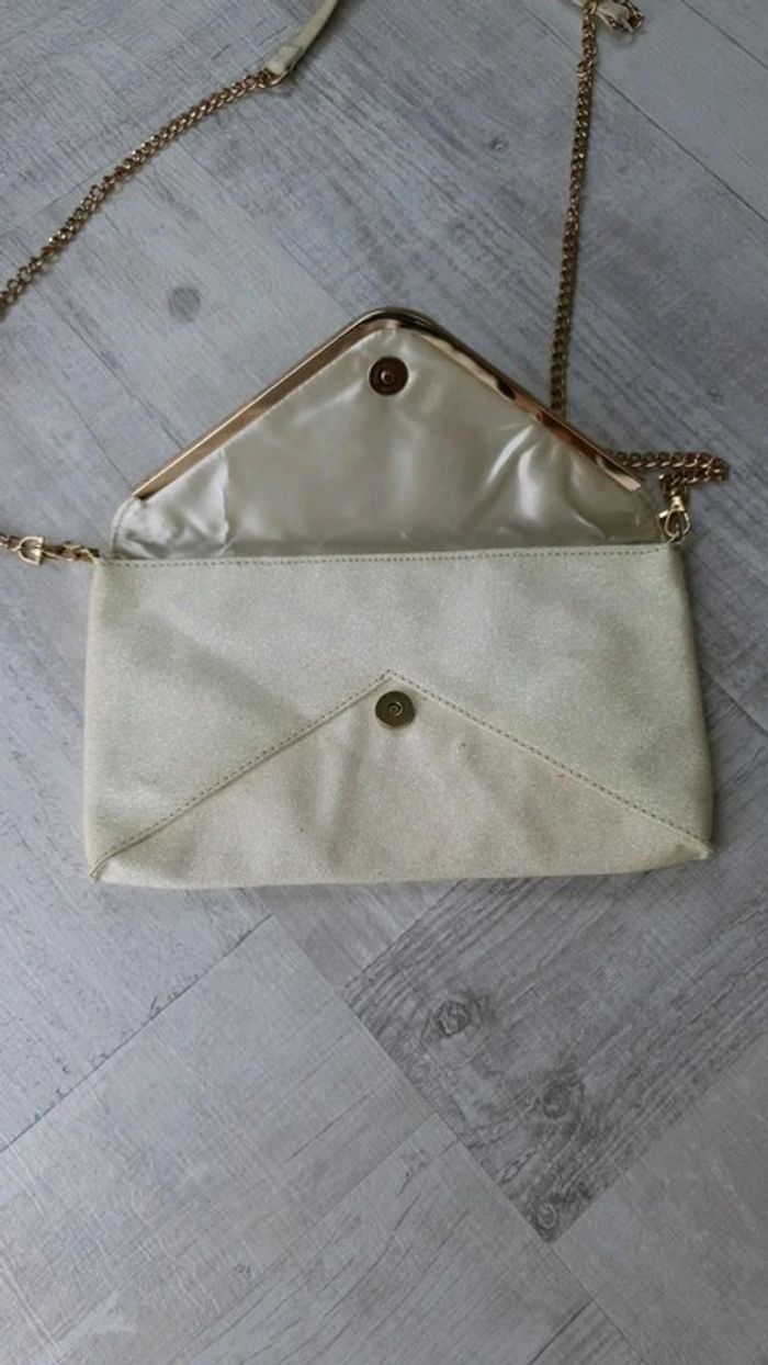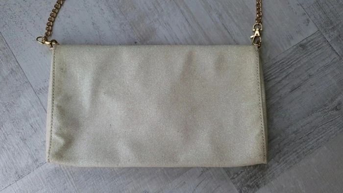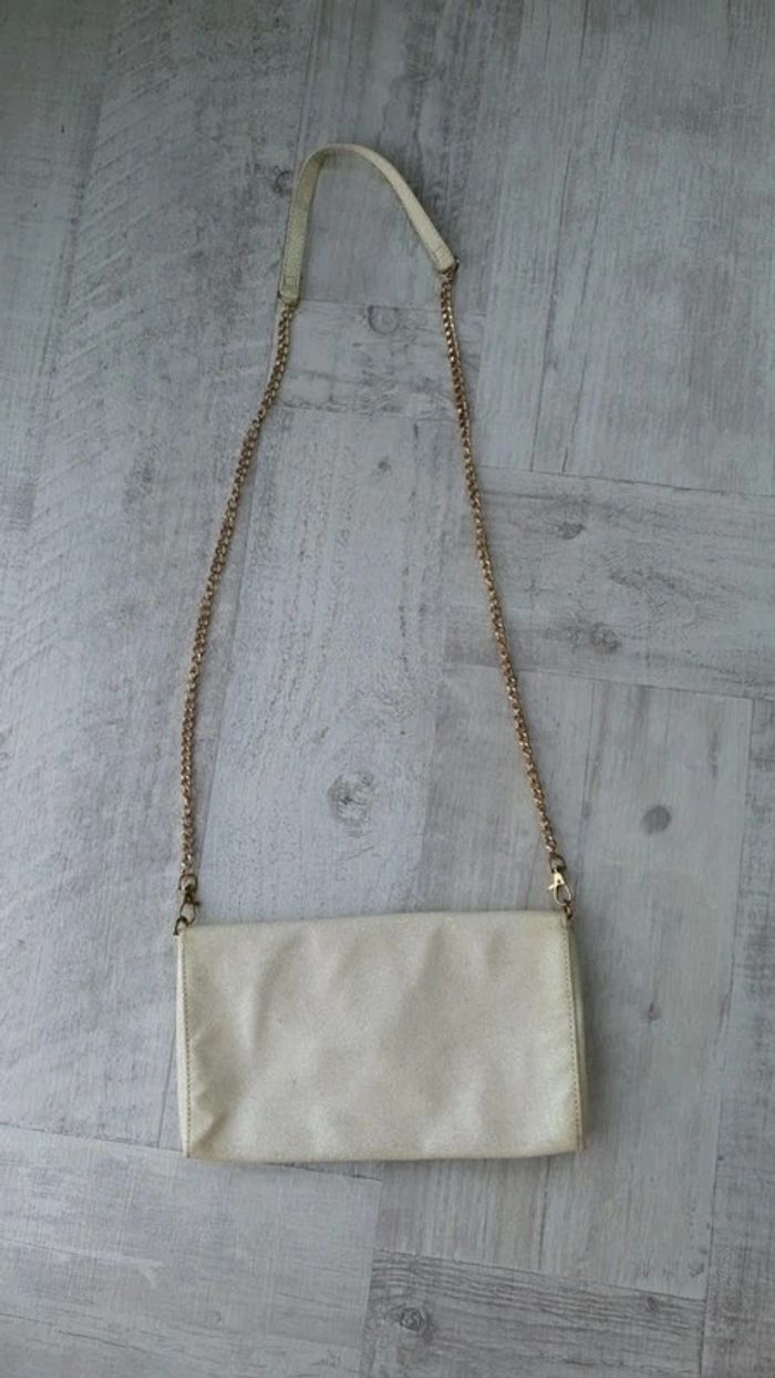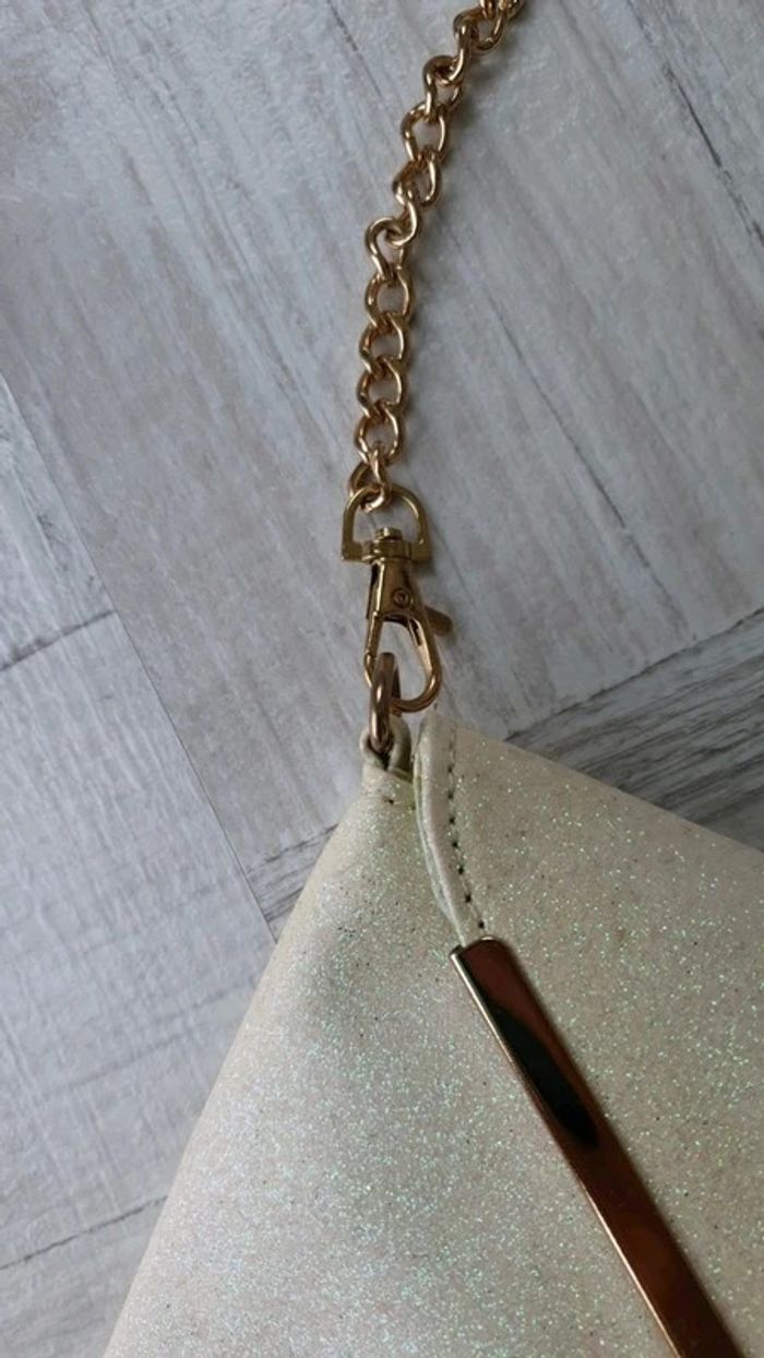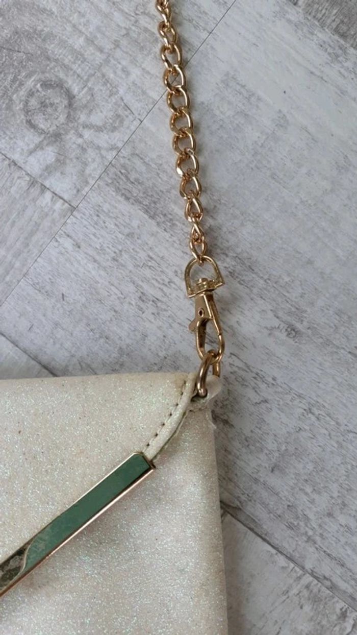 Pochette avec bandoulière qui se retire Dimensions : 29 cm de longueur et 16,5 cm de hauteur Couleur crème pailletée Neuve
