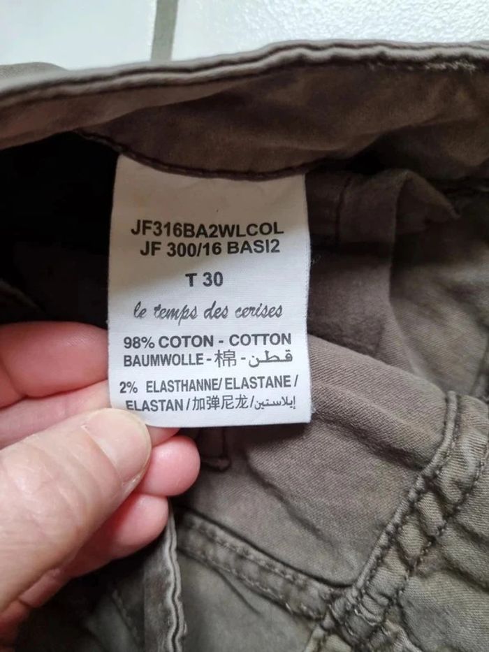Jeans 300/16 Slim Taille 30 (40) Couleur kaki, la couleur est difficile à capter en photo Très bon état, très peu porté Marque Le Temps des Cerises Acheté 69,90€