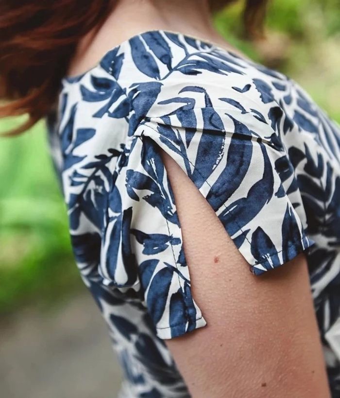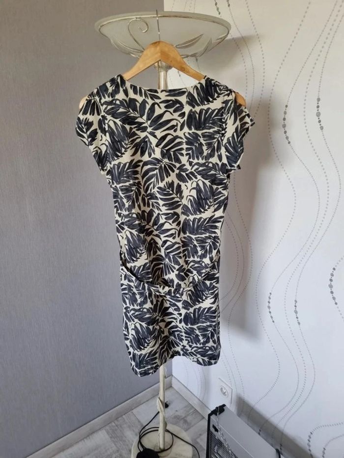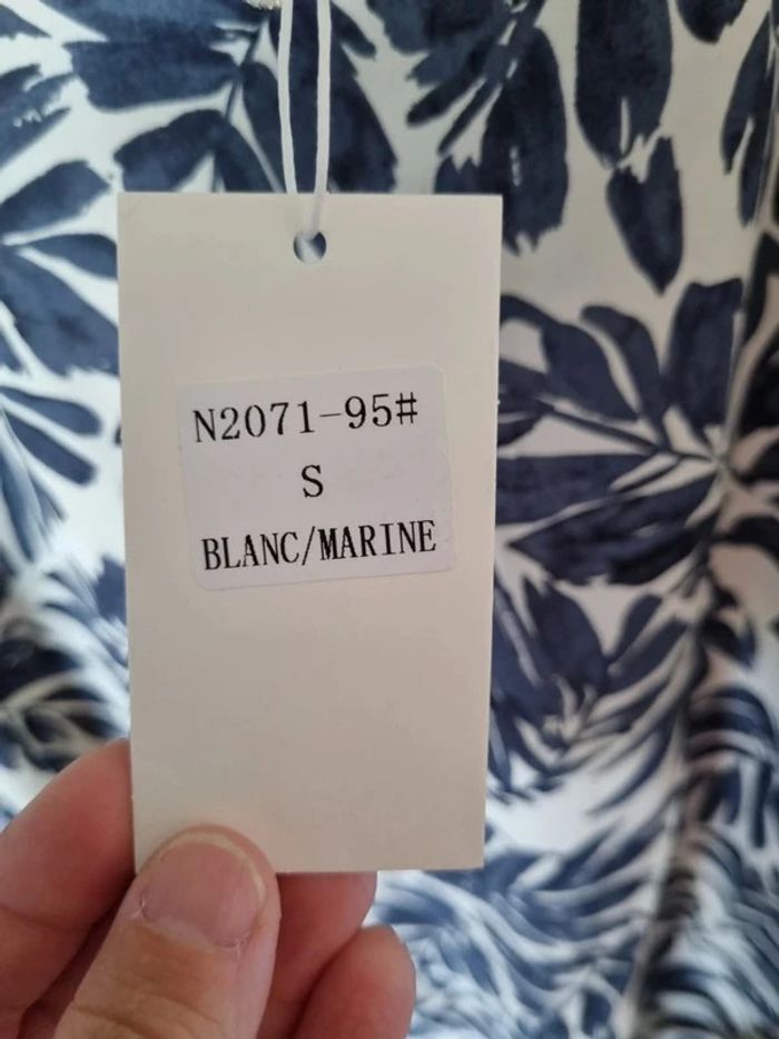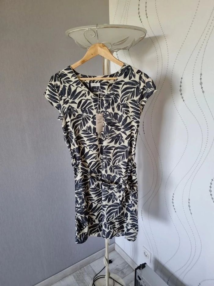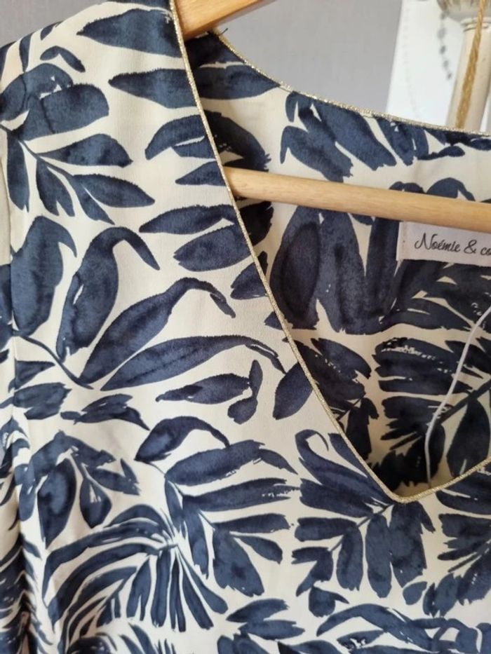 Robe Taille S Marque Noémie & CO Neuve avec étiquette Robe à imprimé feuille marine, manches courtes fendues, ceinture. Composition : 100% Polyester Vous pouvez porter la robe légèrement blousée en attachant la ceinture devant ou la porter plus cintré en attachant la ceinture derrière.