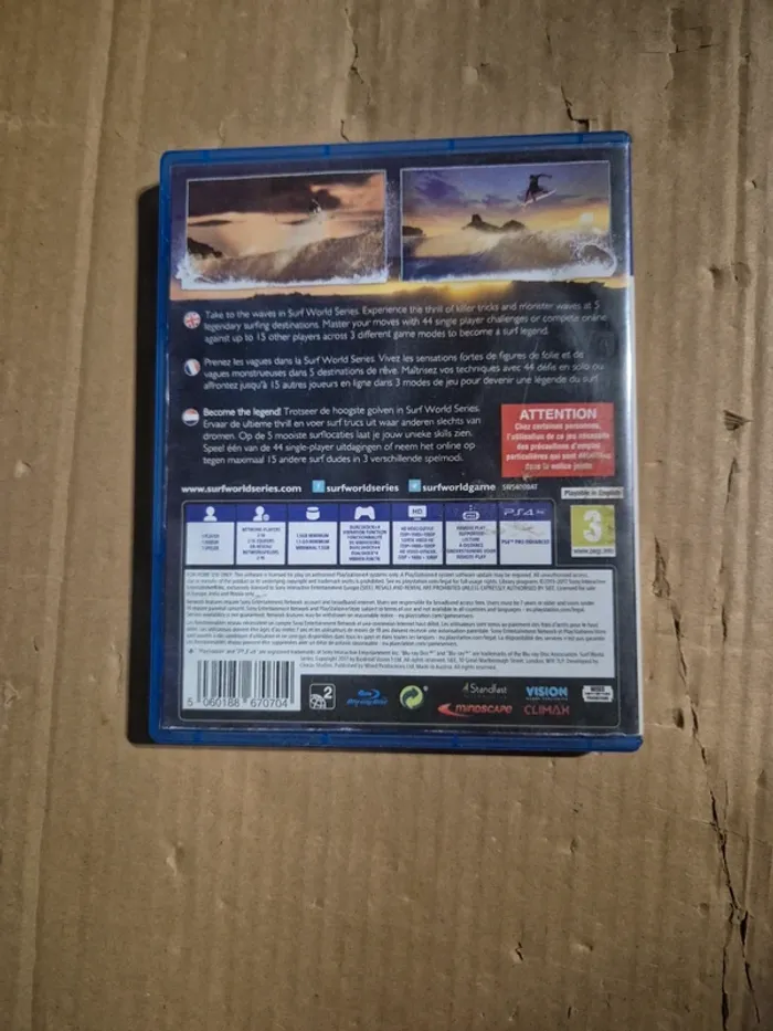 Jeu Surf World Series pour PS4 en bon état. Version française. Le CD est en très bon état. La jaquette n'est pas l'originale mais une photocopie couleur réalisée sur papier épais et satiné #jvtm59_PS4