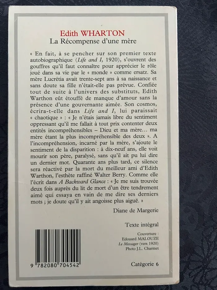 Couverture jaunie et une petite marque sur la première de couverture (voir photo). À Nice, au début du XXe siècle, Kate Clephane lutte pour sa survie sociale. Issue de la haute société new-yorkaise, elle vit aujourd’hui parmi les parias : tous ceux qui, comme elle, ont failli aux yeux du beau monde. Alors qu’elle était une jeune mariée et une jeune mère, Kate a eu une aventure avec un artiste et, rejetée par tous, a fui New York pour la France. Mais, presque vingt ans après son départ, sa fille Anne lui écrit : le mari de Kate est décédé et la fille veut retrouver sa mère. De retour en Amérique, Kate se construit avec Anne un foyer idyllique, que seul un homme pourrait venir troubler… Dans ce roman de 1925, Edith Wharton revient sur un thème qui lui est cher : la tension entre les désirs d’un individu et le poids des conventions sociales. Comme dans Le Temps de l’innocence et Ethan Frome, elle dépeint des personnages en combat permanent pour trouver une place dans un monde qui devrait être le leur. La Récompense d’une mère est l’une de ces tragédies dorées.