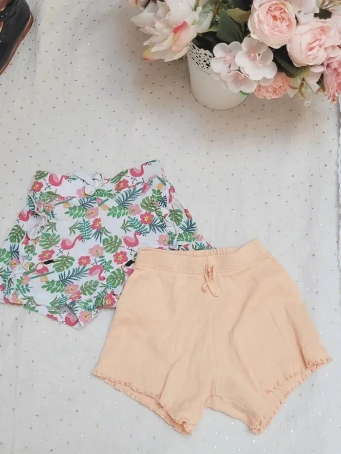 Lot de 2 shorts Coris tropical et Coloris sorbet Taille 18-24 mois Acheté en magasin mais je ne sais plus la marque (étiquette coupée) En coton !