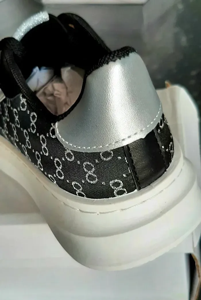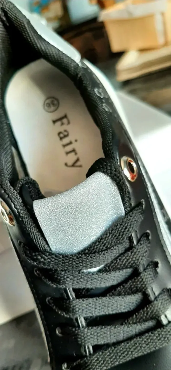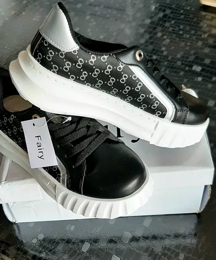 Très belles baskets noires et argentées avec une bonne semelle blanche, très confortables, neuves C'est du 36 mais je fais un 37 et elles me vont parfaitement (photos)