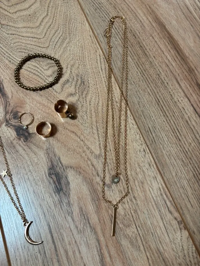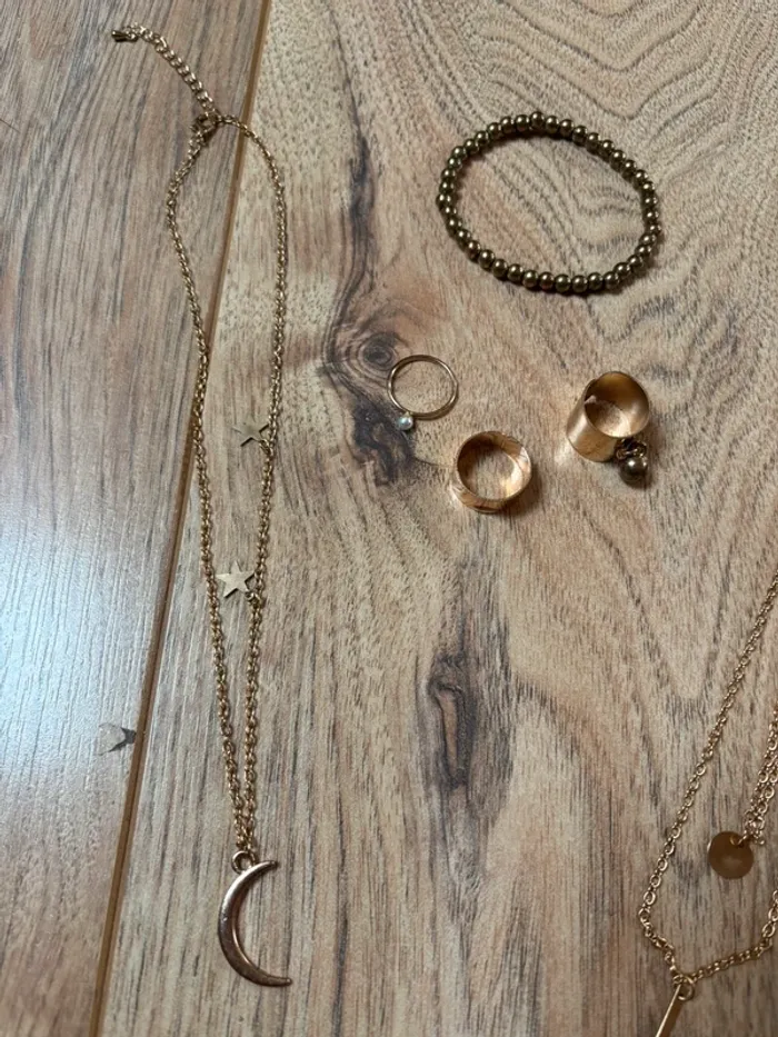 Comprend: Une bague large simple ajustable Une seconde bague large avec pendant perle ronde métallique légèrement noircie ajustable également Un bracelet élastique faites de petites boules dorées Une bague toute fine avec perle Un collier doré simple et court maille fantaisie Un collier double Un collier avec pendants étoiles et lune Le tout en bon et Tbe