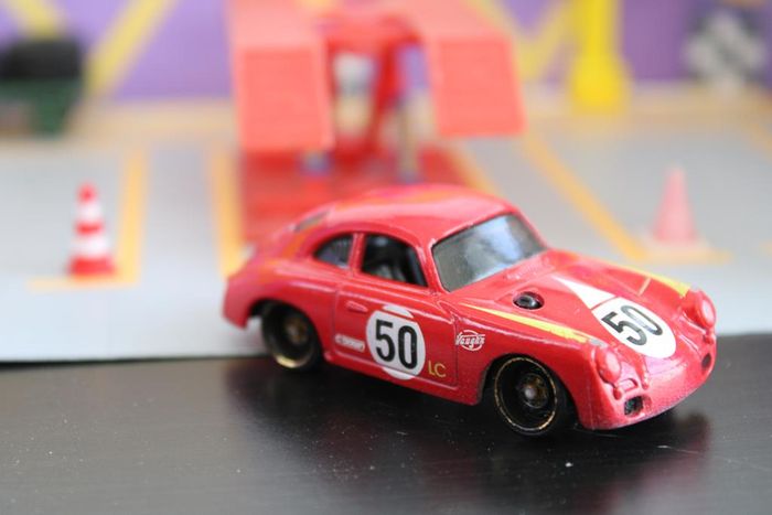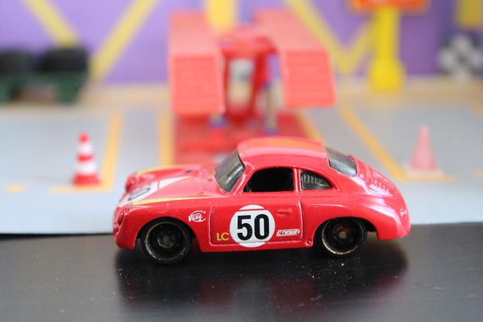 Voiture miniature Porsche 356 A Marque : Porsche Modèle : 356 A Echelle : environ 1:64 Couleur : Rouge, N° de course sur le capot et les côtés, sponsor sur les cotés et bandes jaunes sur les ailes Intérieur : Noir Chassis : Plastique noir Fabricant : Hot wheels Année de production : 2019 sur un moule de 2016 Designer : Mark Jones. Voiture miniature bien détaillée avec des encoches simulant la ventilation du moteur arrière et un bouchon de réservoir à travers le capot. Voiture miniature en bon état. Les axes de roues ne sont pas tordus. Vitrage intact. Rares manques de peinture sur la carrosserie Jusqu'à 15 % de remise pour achat en lot Réponds avec plaisir aux demandes d'informations complémentaires Réponse rapide envoi soigné dans les meilleurs délais