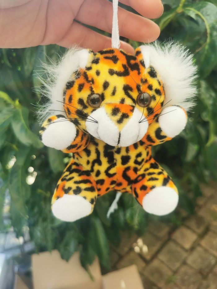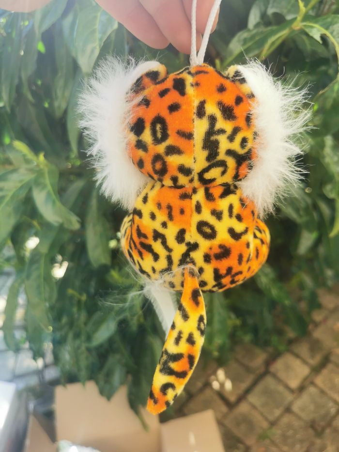 Peluche petit léopard de 12 cm, en très bon état, avec une petite boucle à suspendre, poids 46g.
