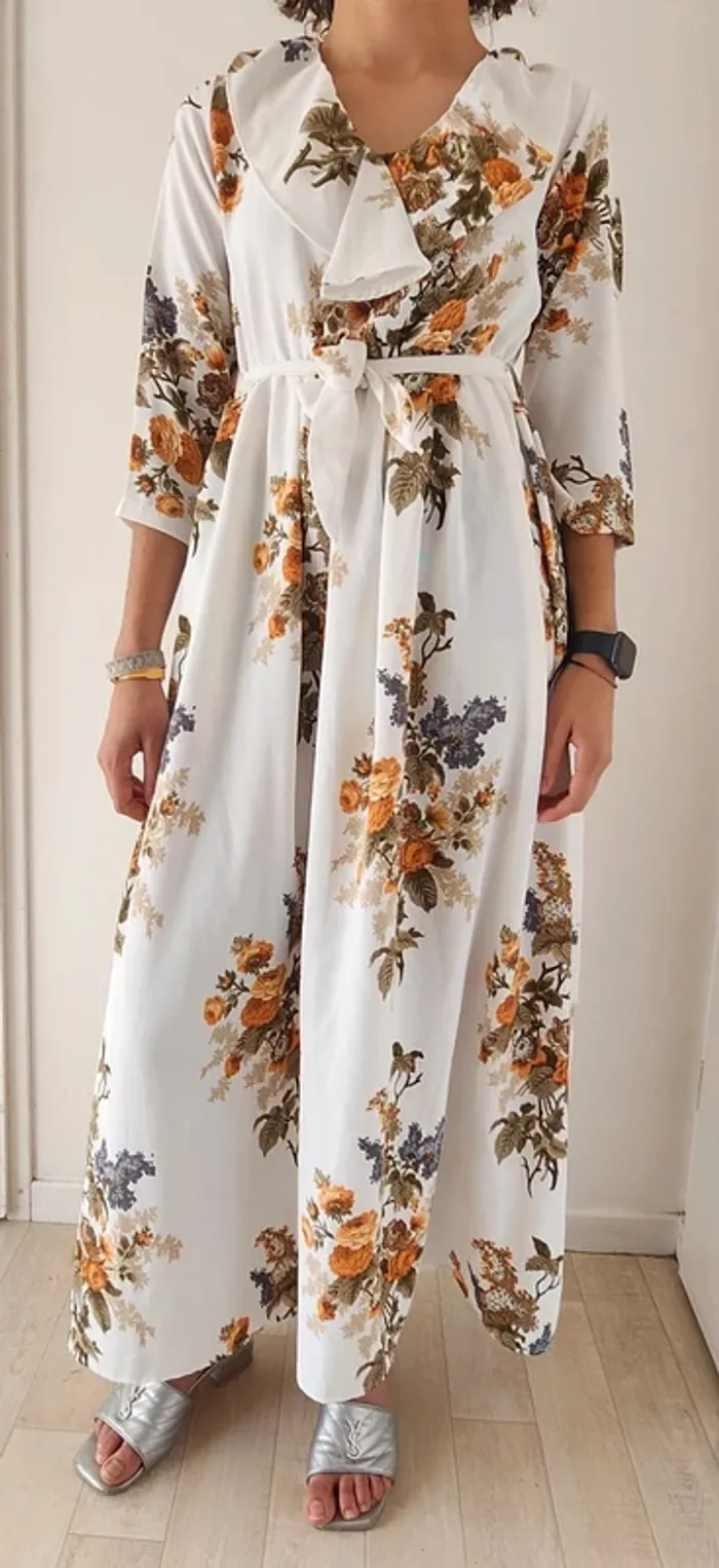 Robe longue fleurie blanche à col volanté – Taille L – Élégante & fluide