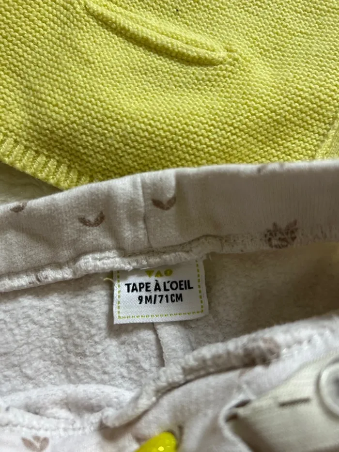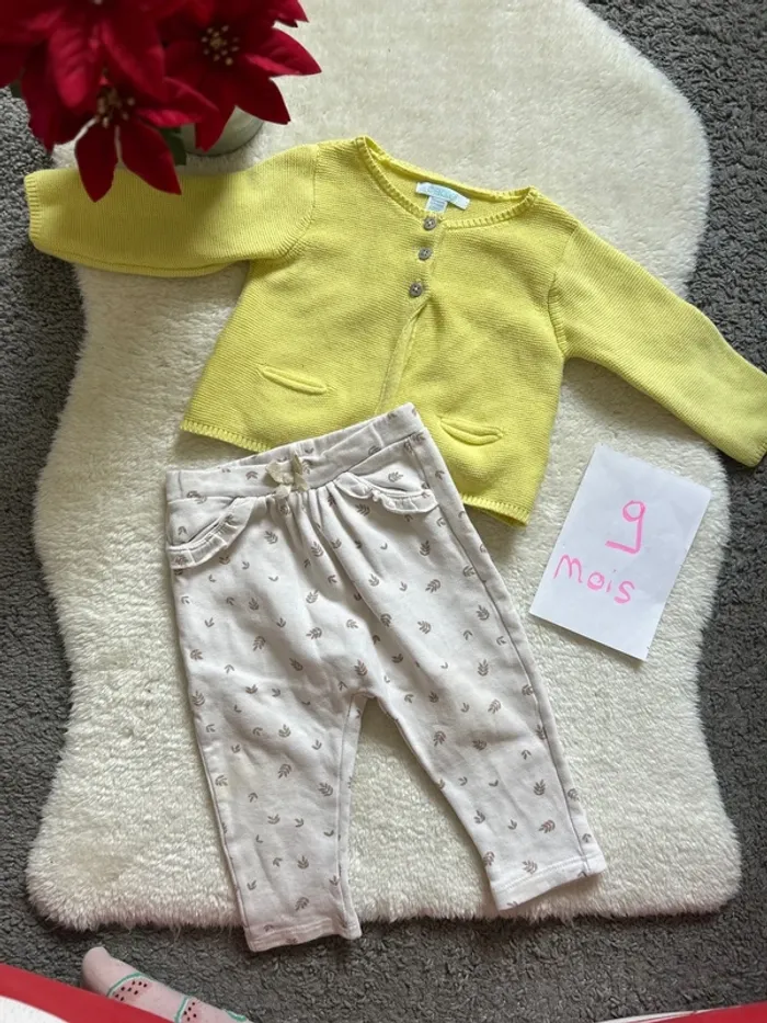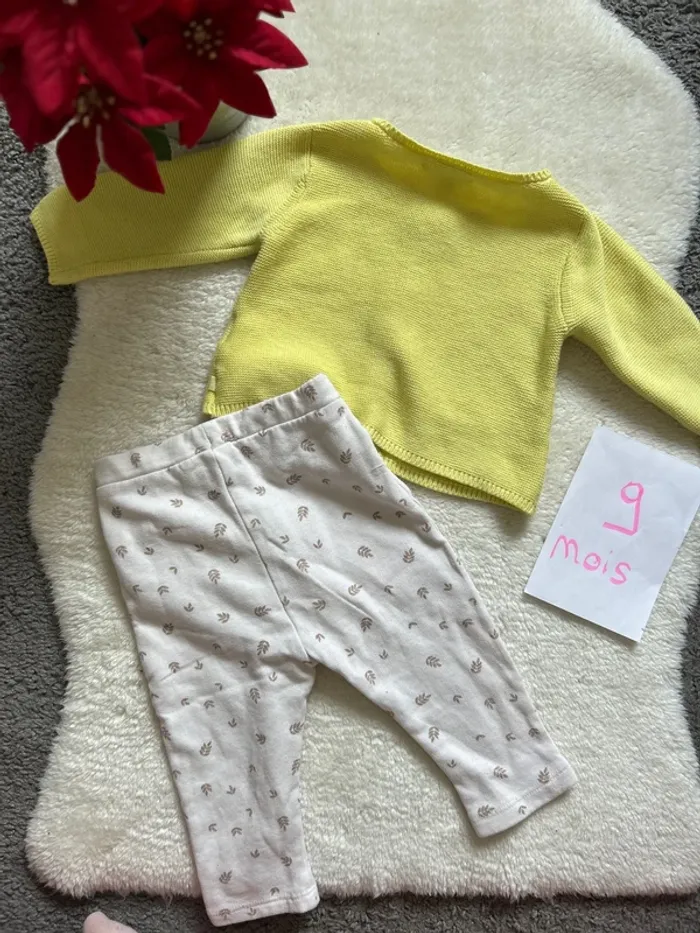 Ensemble Avec son petit gilet vert pomme obaïbi Avec son pantalon blanc a motif feuille tape à l’œil Taille 9 mois En très bon état #charlinelolfille9mois N’hésitez pas si vous avez des questions