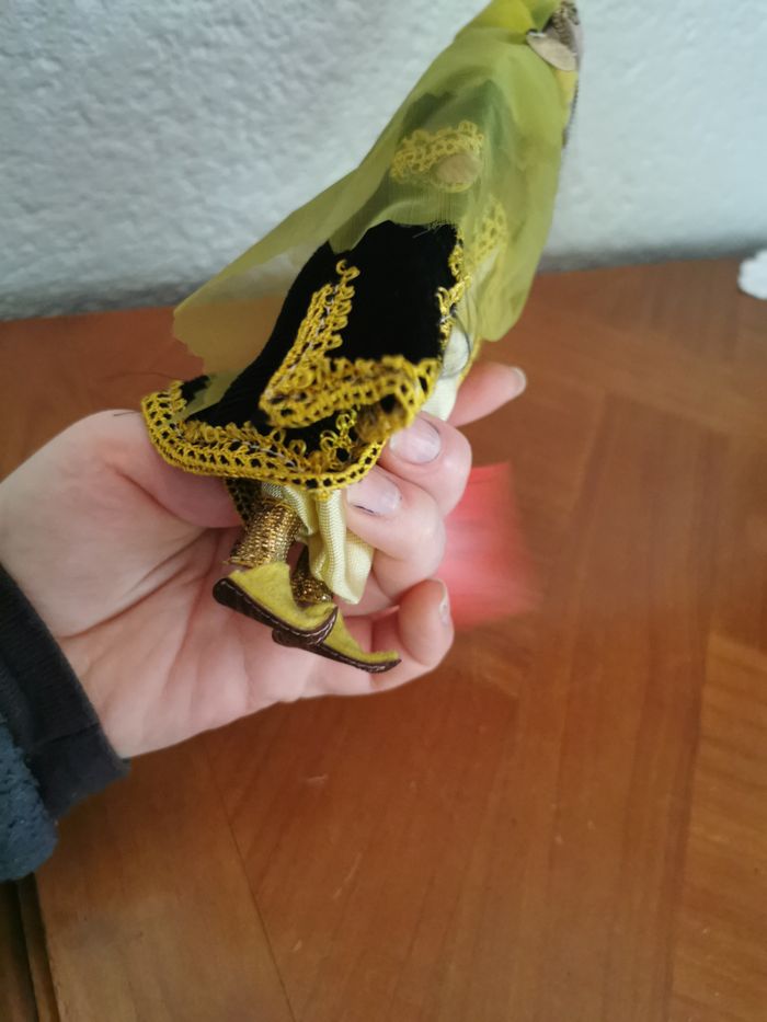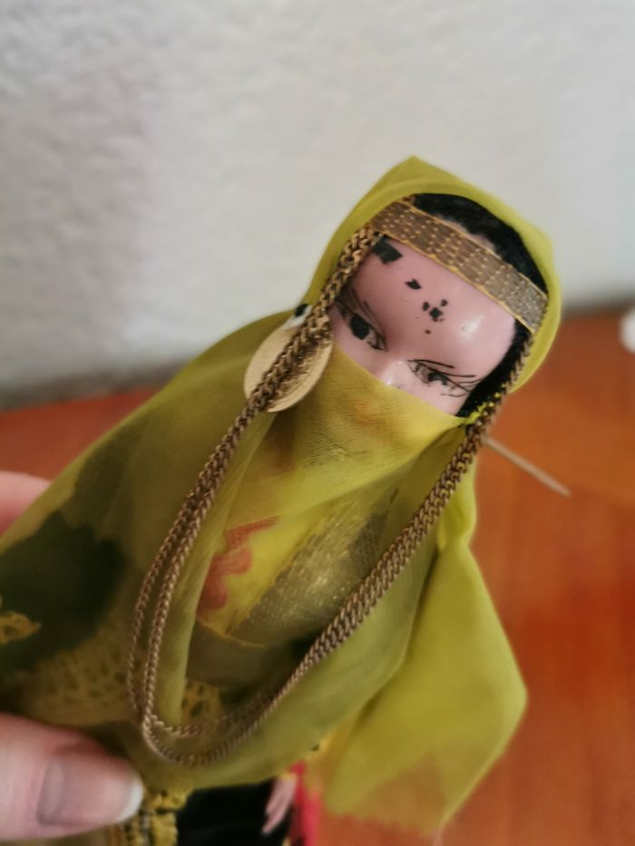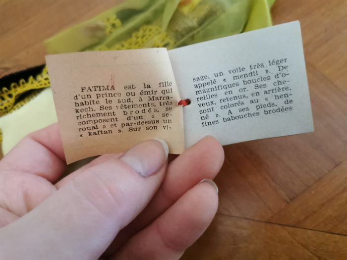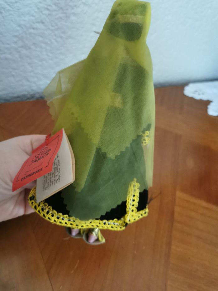 Poupée folklorique Fatima Marrakech Latifa Jamila. Poupée du monde, Afrique du Nord, handmade. Poupée est neuve avec son passeport, sans emballage, ancienne 1960/1970, en plastique ou celluloïd. Etant donné qu'elle est ancienne elle n'a plus l'apprence d'une poupée neuve, poussiéreuses. Poupée dans son costume traditionnel avec les babouches, le visage est partiellement effacé. Taille 20 cm.