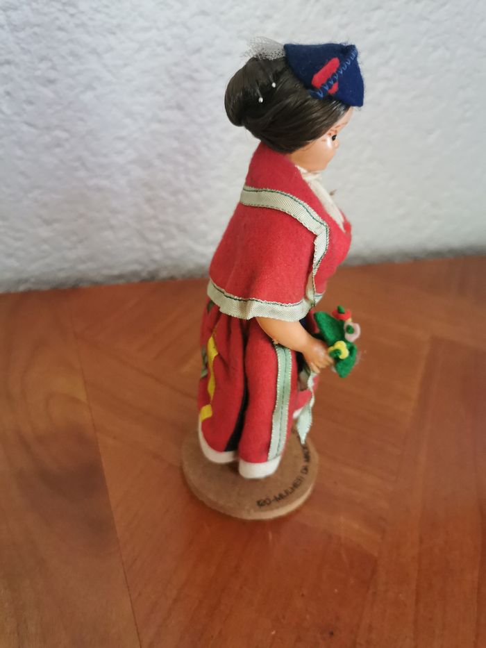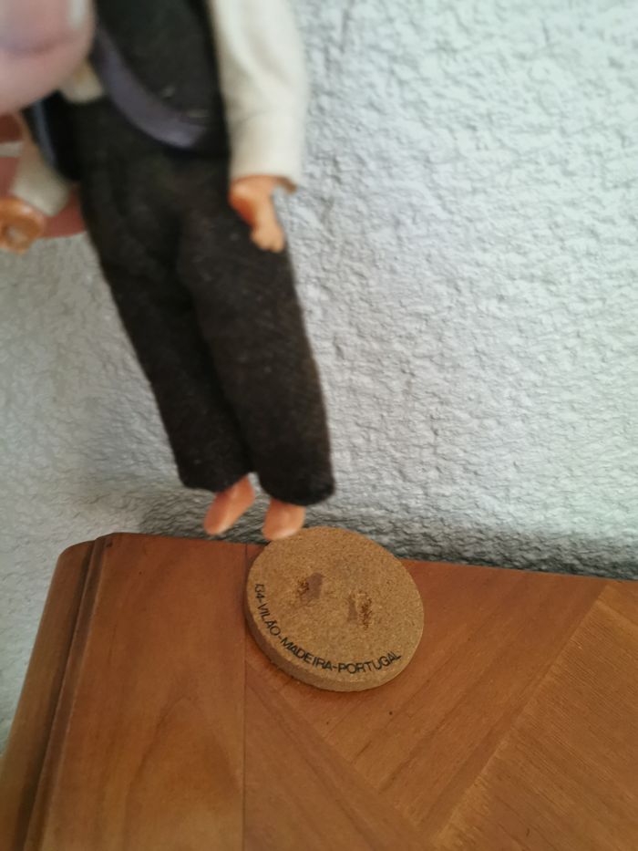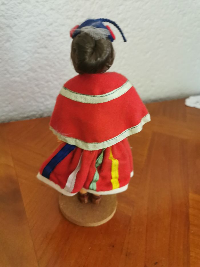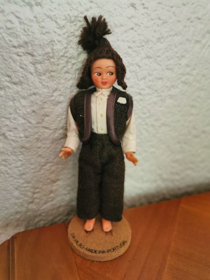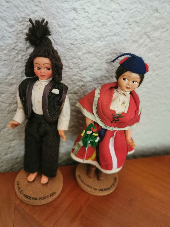 Couple de poupées folkloriques Portugal. Garçon porte l'inscription sur son socle en bouchon de liège N°134 - Vilao-Madeira-Portugal et la fille N°120 - Mulher da Madeira-Portugal. Les poupées sont anciennes, probablement des années 1950/1960 sont en plastique ou celluloïd, vêtues des habits traditionnels en laine ou feutrine. En très bon état général, taille 17-18 cm, poids 119g.