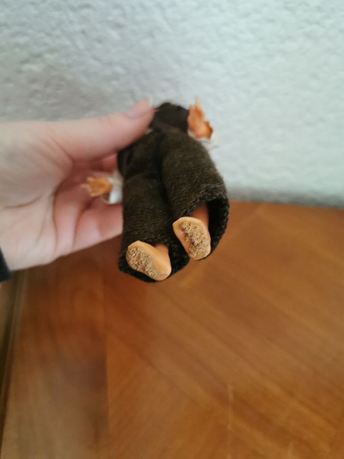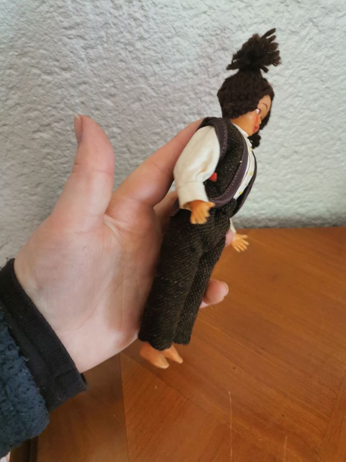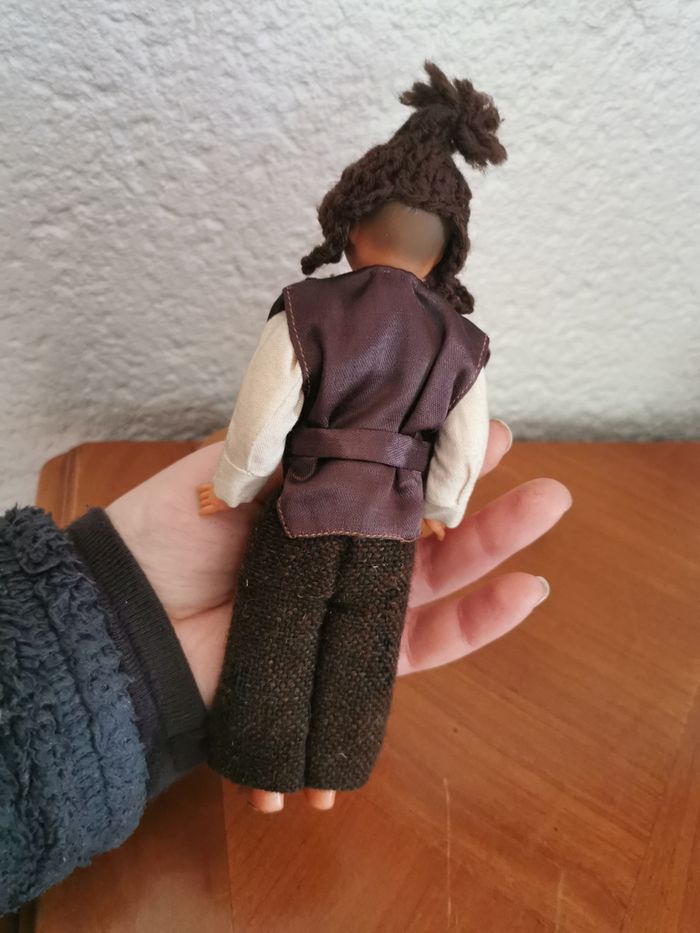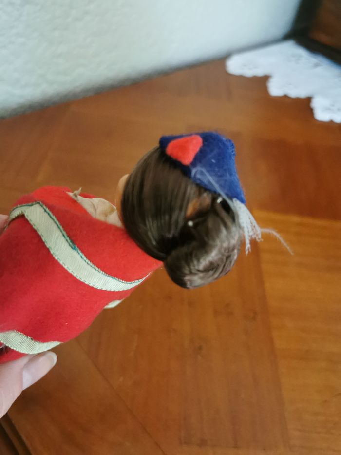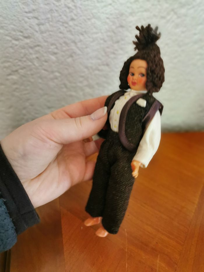 Couple de poupées folkloriques Portugal. Garçon porte l'inscription sur son socle en bouchon de liège N°134 - Vilao-Madeira-Portugal et la fille N°120 - Mulher da Madeira-Portugal. Les poupées sont anciennes, probablement des années 1950/1960 sont en plastique ou celluloïd, vêtues des habits traditionnels en laine ou feutrine. En très bon état général, taille 17-18 cm, poids 119g.