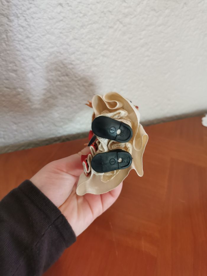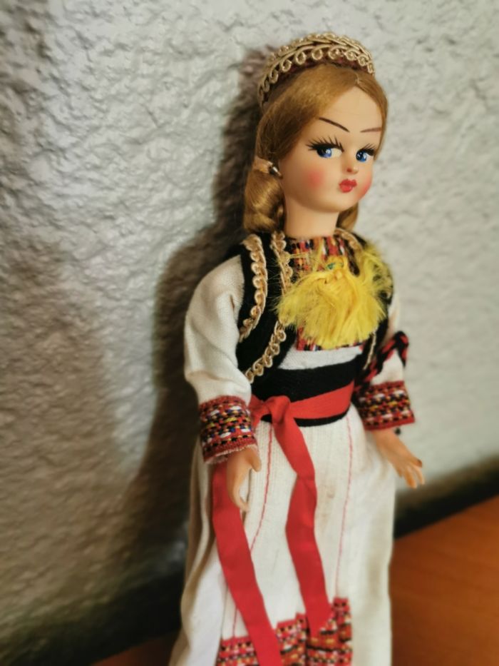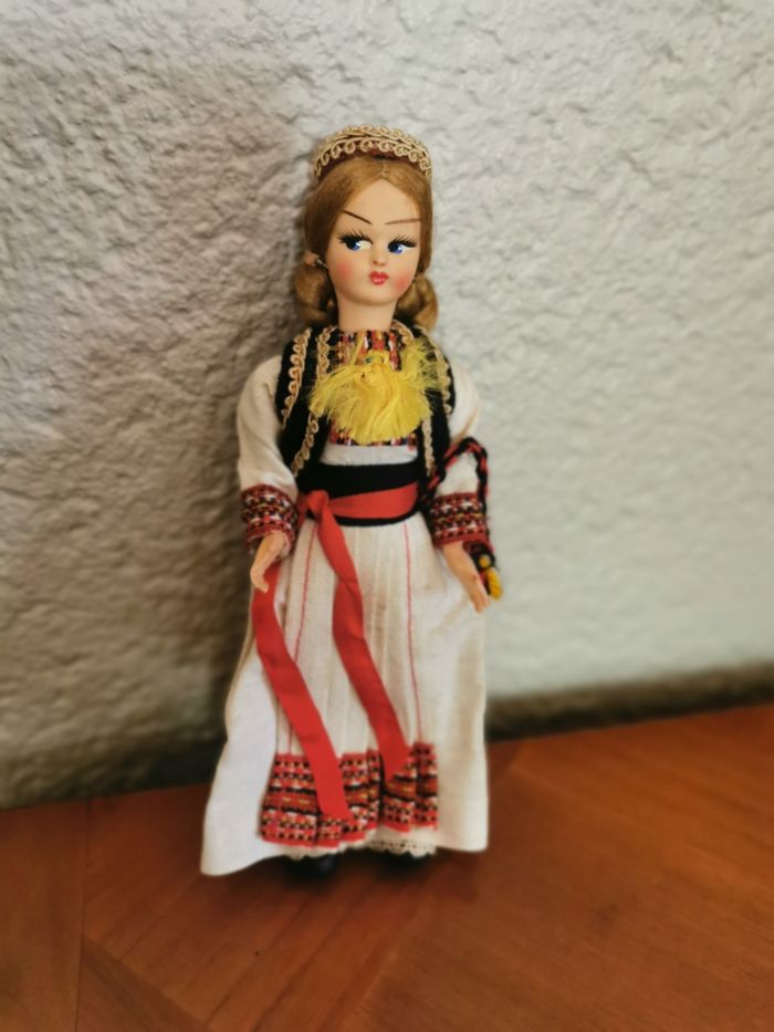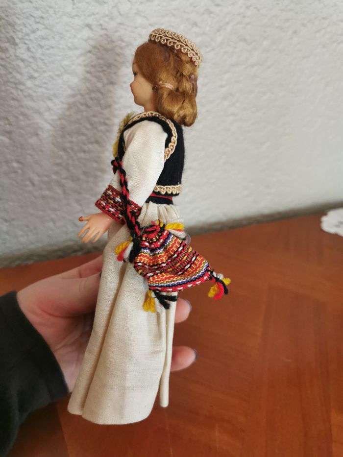 Poupée folklorique Croate en costume traditionnel. Poupée ancienne en plastique et celluloïd, en très bon état général, costume blanc est marqué par le temps, les traces de colle sur les cheveux, le visage peint. Probablement des années 1950/1960, poupée de collection, poupée du monde. Taille 20 cm, poids 62 g.