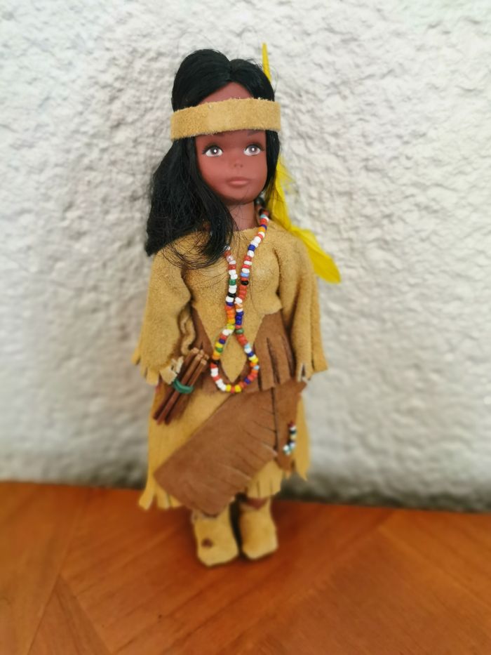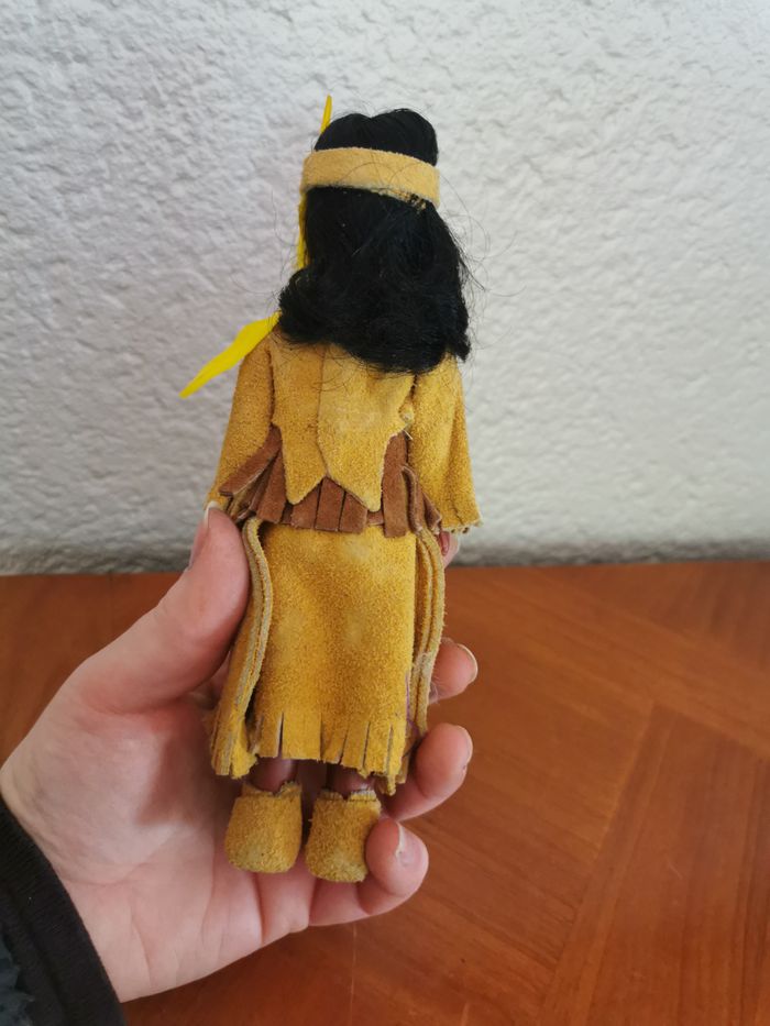 Poupée ancienne folklorique indienne. Belle poupée de collection en plastique ou celluloïd, probablement des années 1960/1970. Costume en daim, légèrement marqué, en très bon état général, taille 19 cm, poids 56g.