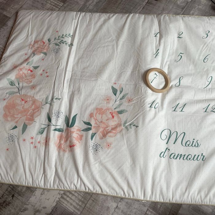 Tapis pour photo mois par mois de bébé de marque vertbaudet 90*110cm 3cm d’épaisseur L’anneau fait 12 cm de diamètre, il est réversible et ce sont des roses.